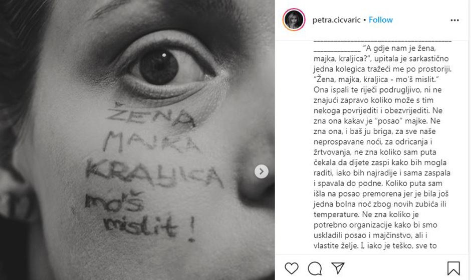 "Ne zna ona kakav je “posao” majke. Ne zna ona, i baš ju briga, za sve naše neprospavane noći, za odricanja i žrtvovanja, ne zna koliko sam puta čekala da dijete zaspi kako bih mogla raditi, iako bih najradije i sama zaspala i spavala do podne. Koliko puta sam išla na posao premorena jer je bila još jedna bolna noć zbog novih zubića ili temperature. Ne zna koliko je potrebno organizacije kako bismo uskladili posao i majčinstvo, ali i vlastite želje. I, iako je teško, sve to radimo iz ljubavi i s jako puno ljubavi. Jer je to odlika žene majke. Možda to samo majke razumiju. Nemam pojma. Ne zna ona i baš ju briga i žao mi je uopće što sam toliko energije potrošila razmišljajući o toj jednoj rečenici. Ali da, riječi stvarno bole. Da skratim ovu priču - JESAM! Svojoj obitelji jesam. Bez lažne skromnosti. I svaka majka je kraljica u svojoj obitelji. Zato glavu gore žene, nemojte da vam padne kruna s glave !" zaključila je Petra.