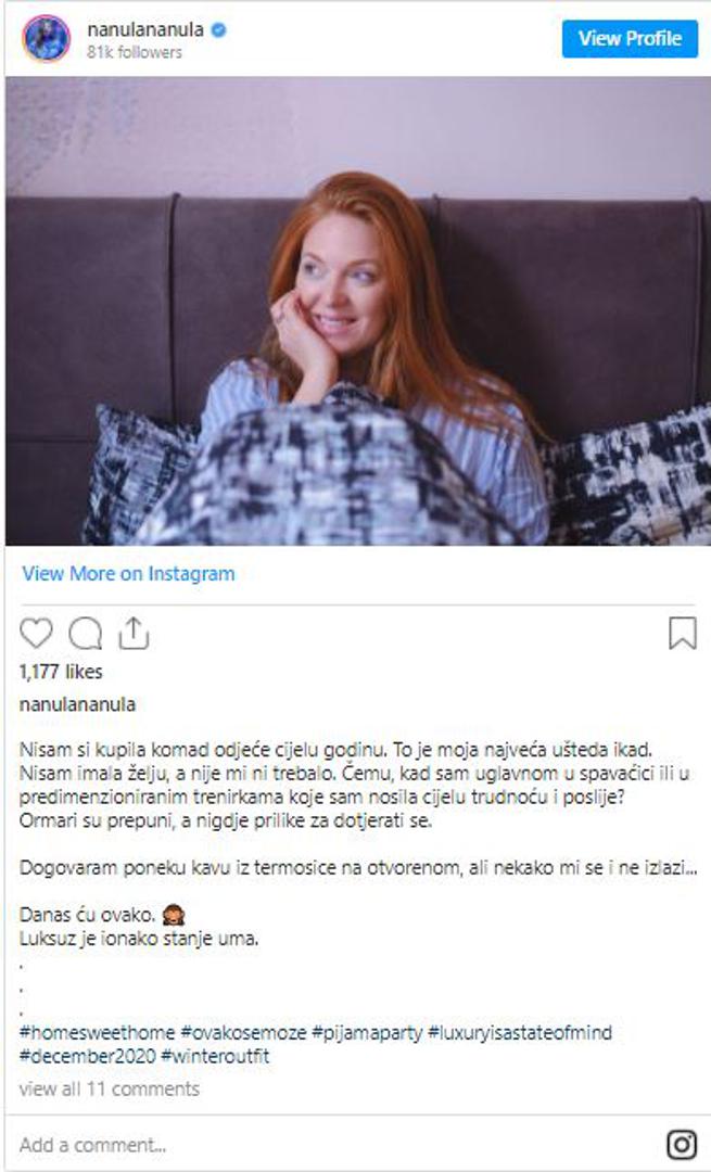 - Nisam si kupila komad odjeće cijelu godinu. To je moja najveća ušteda ikad. Nisam imala želju, a nije mi ni trebalo. Čemu, kad sam uglavnom u spavaćici ili u predimenzioniranim trenirkama koje sam nosila cijelu trudnoću i poslije? Ormari su prepuni, a nigdje prilike za dotjerati se. Dogovaram poneku kavu iz termosice na otvorenom, ali nekako mi se i ne izlazi... Danas ću ovako. Luksuz je ionako stanje uma - napisala je Nataša.
