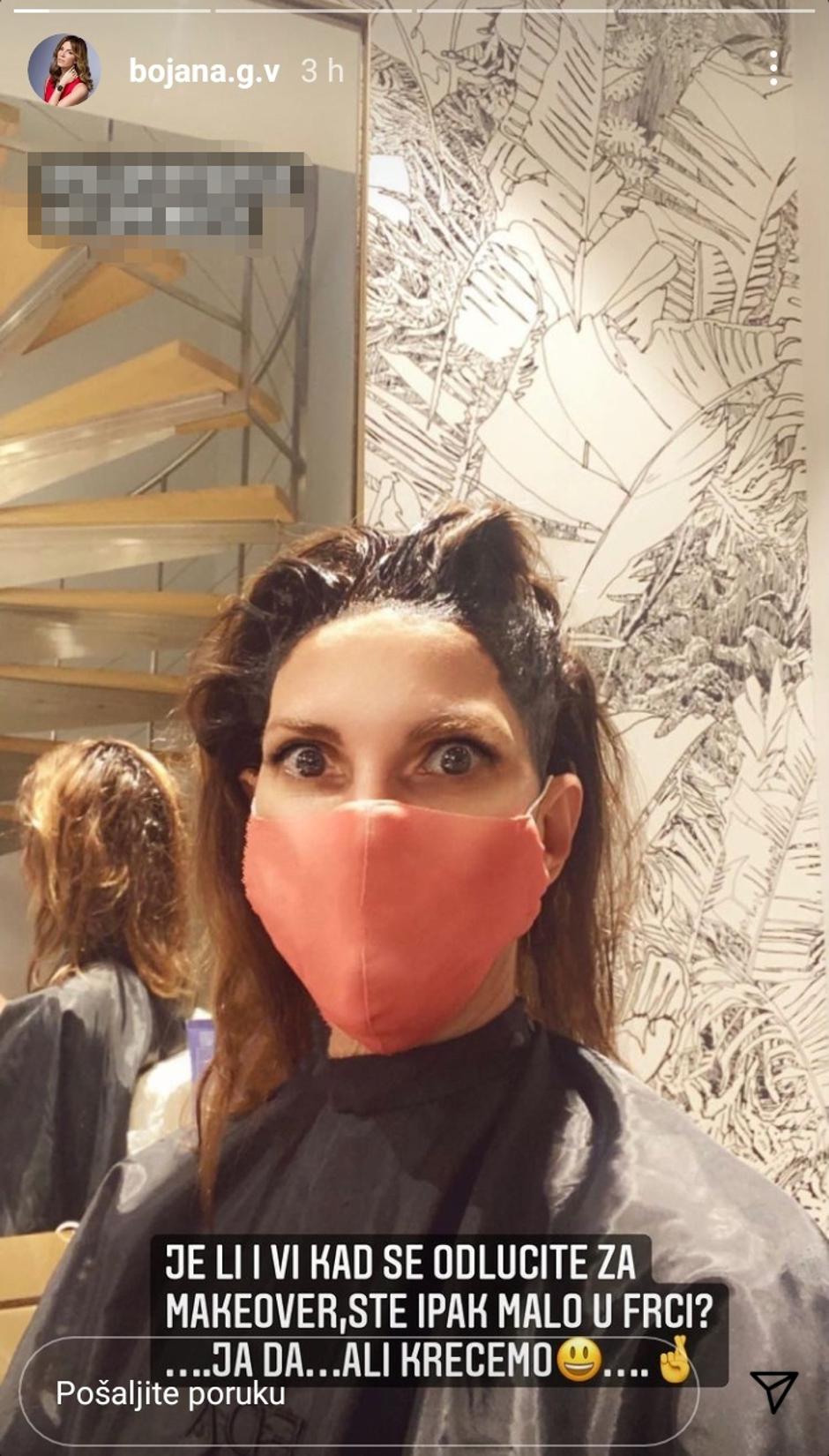 Glumica Bojana Gregorić Vejzović (49) na svojem je Instagramu podijelila objavu kojom je otkrila da planira nešto promijeniti. „Je li i vi, kad se odlučite za makeover, ste ipak malo u frci? Ja da, ali krećemo…“, napisala je na Storyju na kojem se vidi da se nalazi u frizerskom salonu te da se odlučila za promjenu frizure.