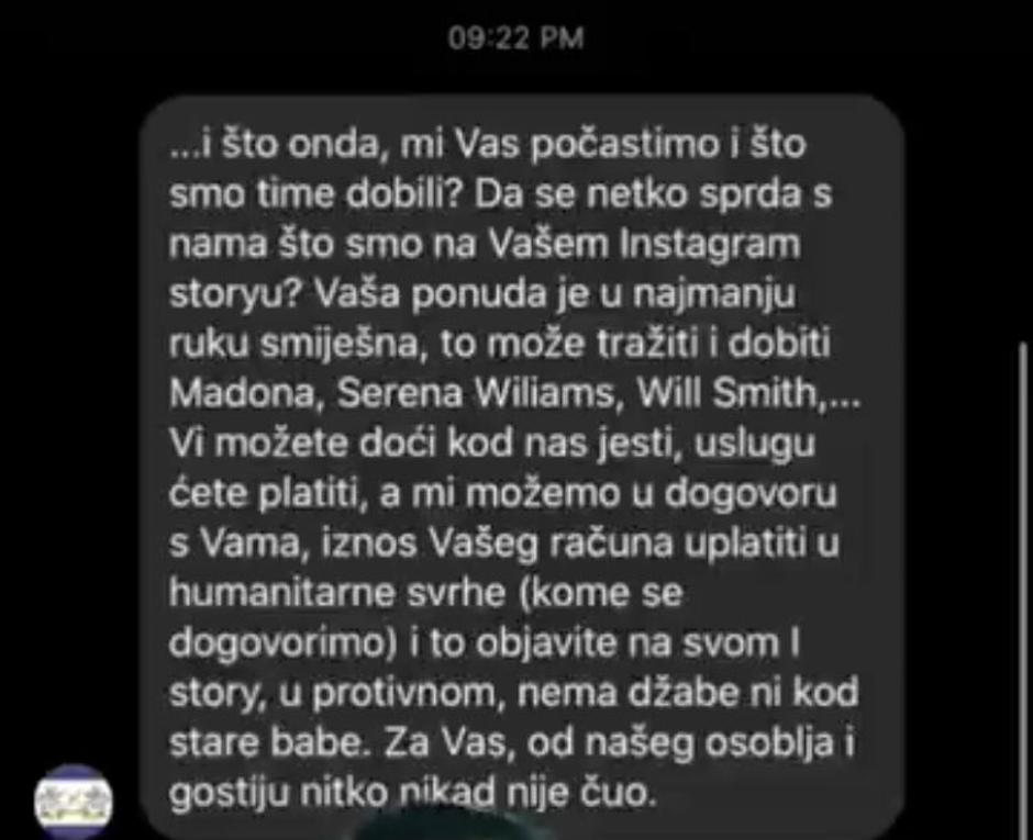 "I što onda, što smo time dobili? Da se netko sprda s nama zato što smo na vašem Instagram storyju? Vaša ponuda je u najmanju ruku smiješna, to može tražiti i dobiti Madonna, Serena Wiliams, Will Smith. Vi možete doći kod nas i jesti, uslugu ćete platiti, a mi možemo u dogovoru s vama iznos vašeg računa uplatiti u humanitarne svrhe i to objavite na svom storyju. U protivnom nema džabe ni kod stare babe", poručili su joj nakon ponude, a odbijanje joj je jako teško palo jer je na svom TikToku odlučila oblatiti restoran što je odjeknulo na Twitteru te je zbog istog postala i predmet ismijavanja.