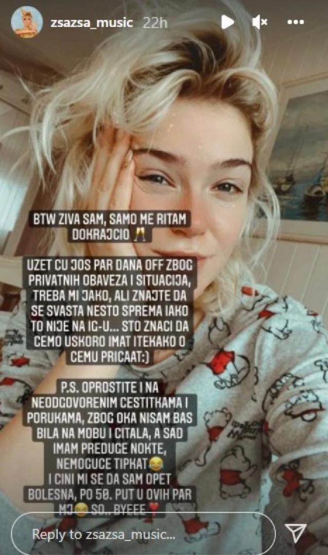 -Živa sam, samo me ritam dokrajčio. Uzet ću još par dana off zbog privatnih obaveza i situacija, treba mi jako, ali znajte da se svašta nešto sprema iako to nije na Instagramu. Što znači da ćemo uskoro ima itekako o čemu pričati- napisala je pjevačica uz fotografiju na Instagram storyju, a ispričala se i što nije odgovarala na poruke i čestitke, pa otkrila kako je opet bolesna, ’50. put u ovih par mjeseci'.