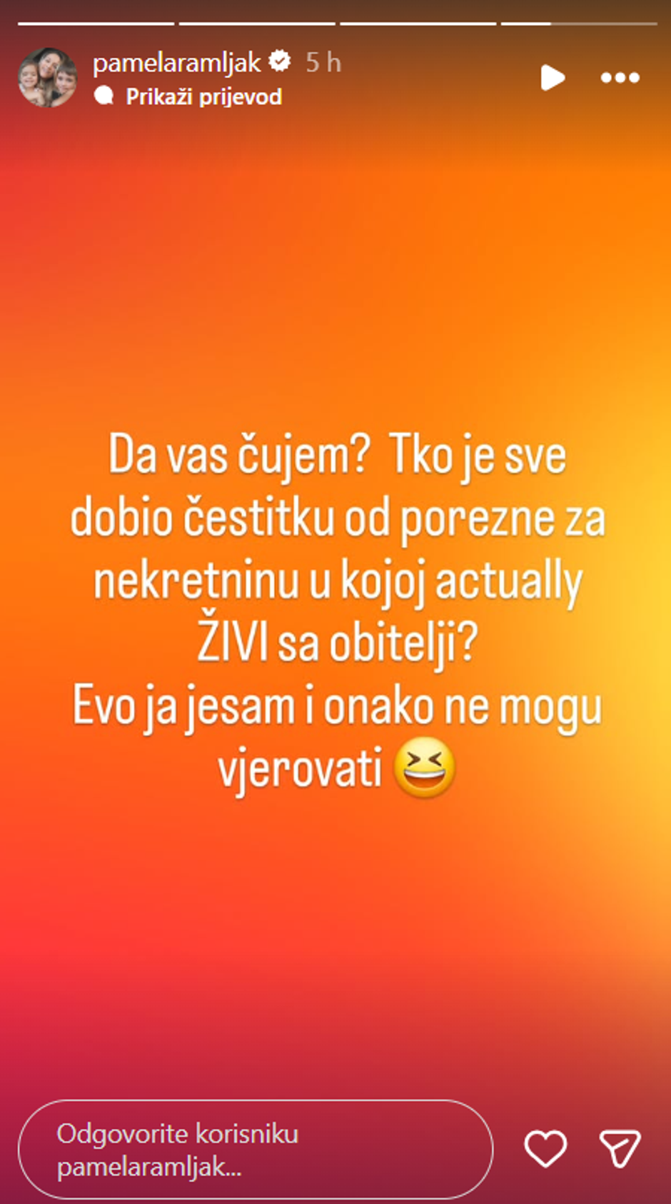 Naša glazbenica i članica grupe Feminnem, 46-godišnja Pamela Ramljak na društvenoj mreži Instagram podijelila je jednu zanimljivost. Naime, riječ je o 'čestitci' iz Porezne uprave na nekretninu, no u ovom slučaju, pjevačica ističe da u istoj stanuje s obitelji. "Da vas čujem? Tko je sve dobio čestitku od Porezne za nekretninu u kojoj zapravo živi s obitelji? Evo ja jesam, i onako, ne mogu vjerovati", napisala je pjevačica u svojoj Instagram priči. Ako se prisjetimo, Večernji list prošlog je tjedna pisao o spomenutim "čestitkama" koje su građani počeli dobivati od Porezne uprave. Izvijestili su javnost kako su vlasnicima nekretnina počela izdavanja rješenja o utvrđivanju obveze poreza na nekretnine za 2025. godinu, čime se obračunava taj porez drugu godinu zaredom. Kako su istaknuli iz Porezne uprave, rješenja se donose prema stanju, namjeni i vlasništvu nekretnine na dan 31. ožujka 2025. godine, a postupak utvrđivanja porezne obveze provodi se na temelju podataka kojima Porezna uprava raspolaže, podataka iz evidencija komunalne naknade te ostalih podataka koji su od utjecaja na utvrđivanje porezne obveze, koje su Poreznoj upravi, kao nadležnom poreznom tijelu za utvrđivanje i naplatu poreza na nekretnine, dostavila upravna tijela jedinica lokalne samouprave i porezni obveznici. "U slučaju da porezni obveznici zaprime rješenje za koje smatraju da je utemeljeno na pogrešnim podacima, preporučujemo da u zakonskom roku izjave žalbu kako bi se u žalbenom postupku provjerile sve činjenice", naveli su iz Porezne uprave.