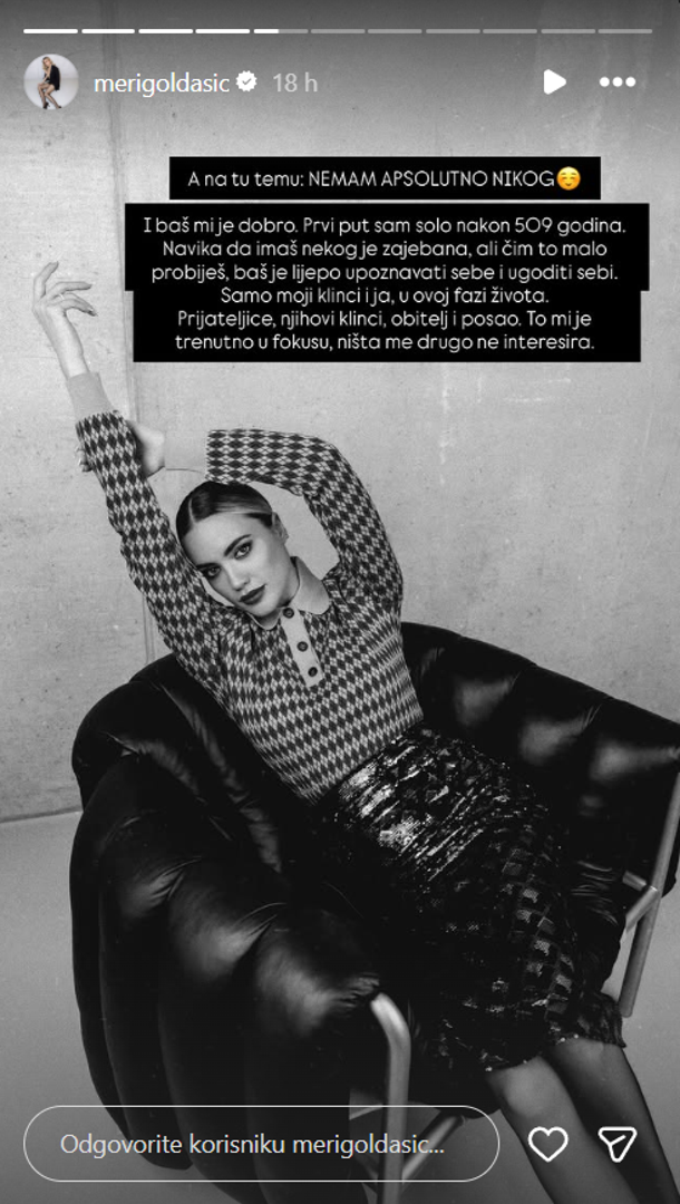 Naša influencerica Meri Goldašić nedavno je potvrdila kako se razvela od supruga Jurice, a sada je na društvenim mrežama prvi put progovorila o svom ljubavnom statusu. "A na tu temu: NEMAM APSOLUTNO NIKOG. I baš mi je dobro. Prvi put sam solo nakon 509 godina. Navika da imaš nekog je zajebana, ali čim to malo probiješ, baš je lijepo upoznavati sebe i ugoditi sebi. Samo moji klinci i ja, u ovoj fazi života. Prijateljice, njihovi klinci, obitelj i posao. To mi je trenutno u fokusu, ništa me drugo ne interesira", poručila je Meri.