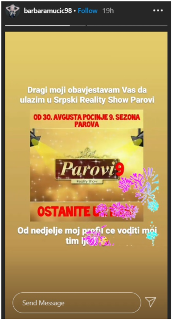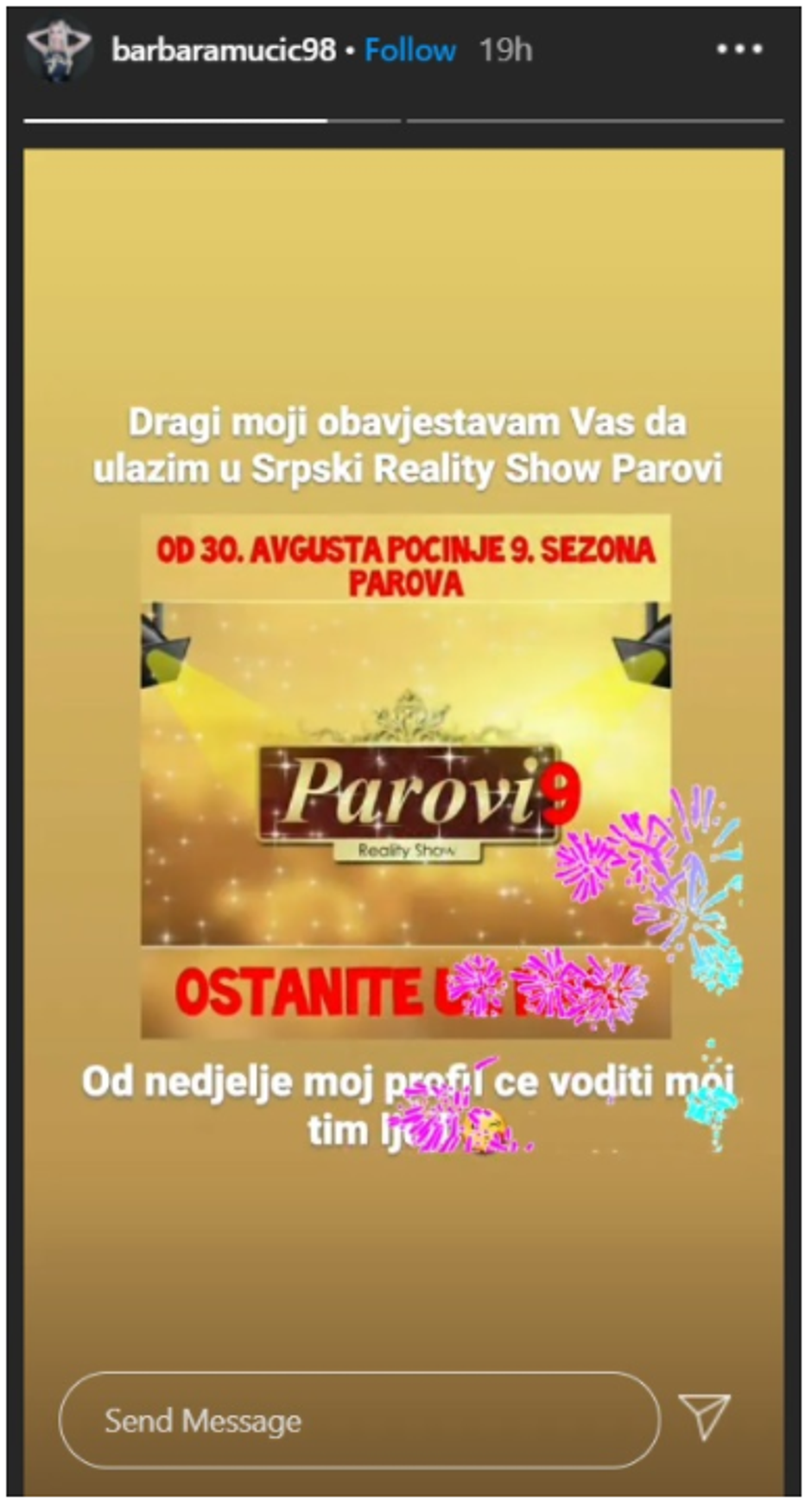 Dragi moji, obavještavam vas da ulazim u srpski reality show Parovi. Od nedjelje moj profil će voditi moj tim ljudi - poručila je bivša sudionica "Gospodina Savršenog" Barbara Mucić preko društvenih mreža i iznenadila fanove odlukom o sudjelovanju u jednom od najkontroverznijih reality emisija ove regije.