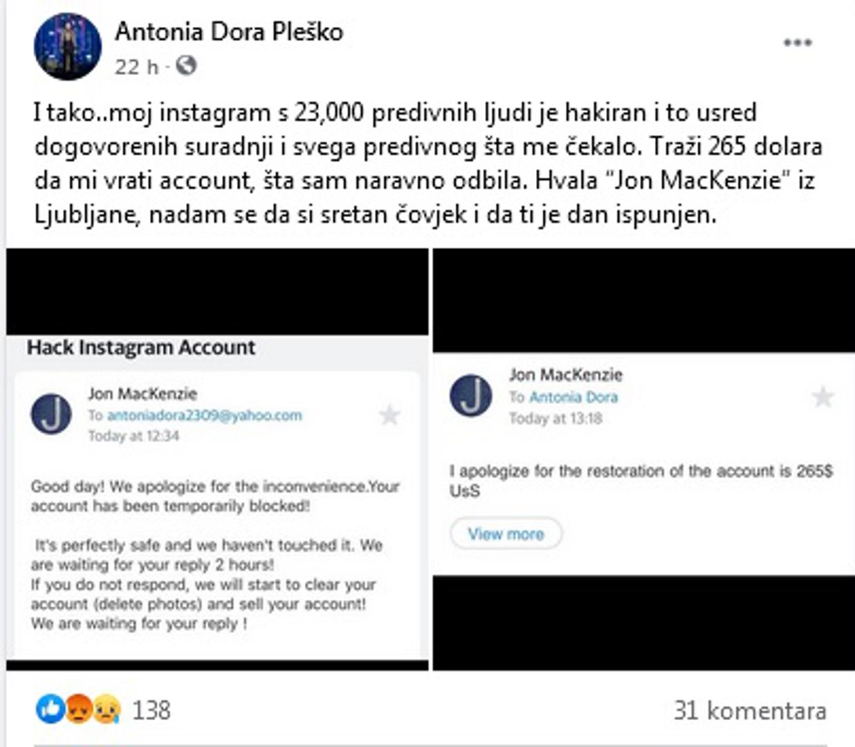 Nešto ranije na Facebooku se požalila i na hakere koji su je ucijenili. - Moj Instagram s 23.000 predivnih ljudi je hakiran i to usred dogovorenih suradnji i svega predivnog što me čekalo. Traži 265 dolara (oko 1600 kuna) da mi vrati account, što sam naravno odbila. Hvala 'Jon MacKenzie' iz Ljubljane. Nadam se da si sretan čovjek i da ti je dan ispunjen - poručila je Pleško uz e-mail koji je stigao na njezinu adresu od anonimnog drznika. Pratitelji su joj odmah savjetovali da cijeli slučaj prijavi policiji i Instagramu, a Antoniju su pokušali utješiti riječima podrške.
