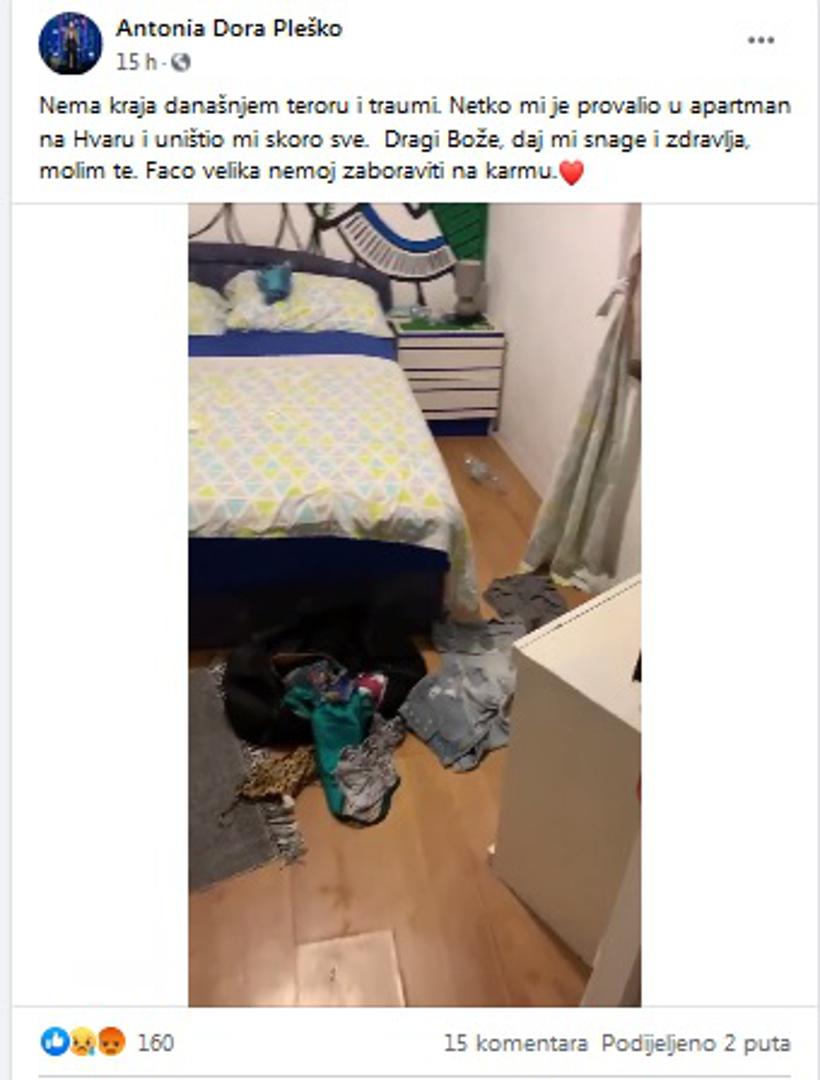 - Nema kraja teroru i traumi. Netko mi je provalio u apartman na Hvaru i uništio mi skoro sve. Dragi Bože, daj mi snage i zdravlja, molim te. Faco velika nemoj zaboraviti na karmu - poručila je Pleško uz video iz apartmana na kojem se vidi nered koji su provalnici ostavili iza sebe.