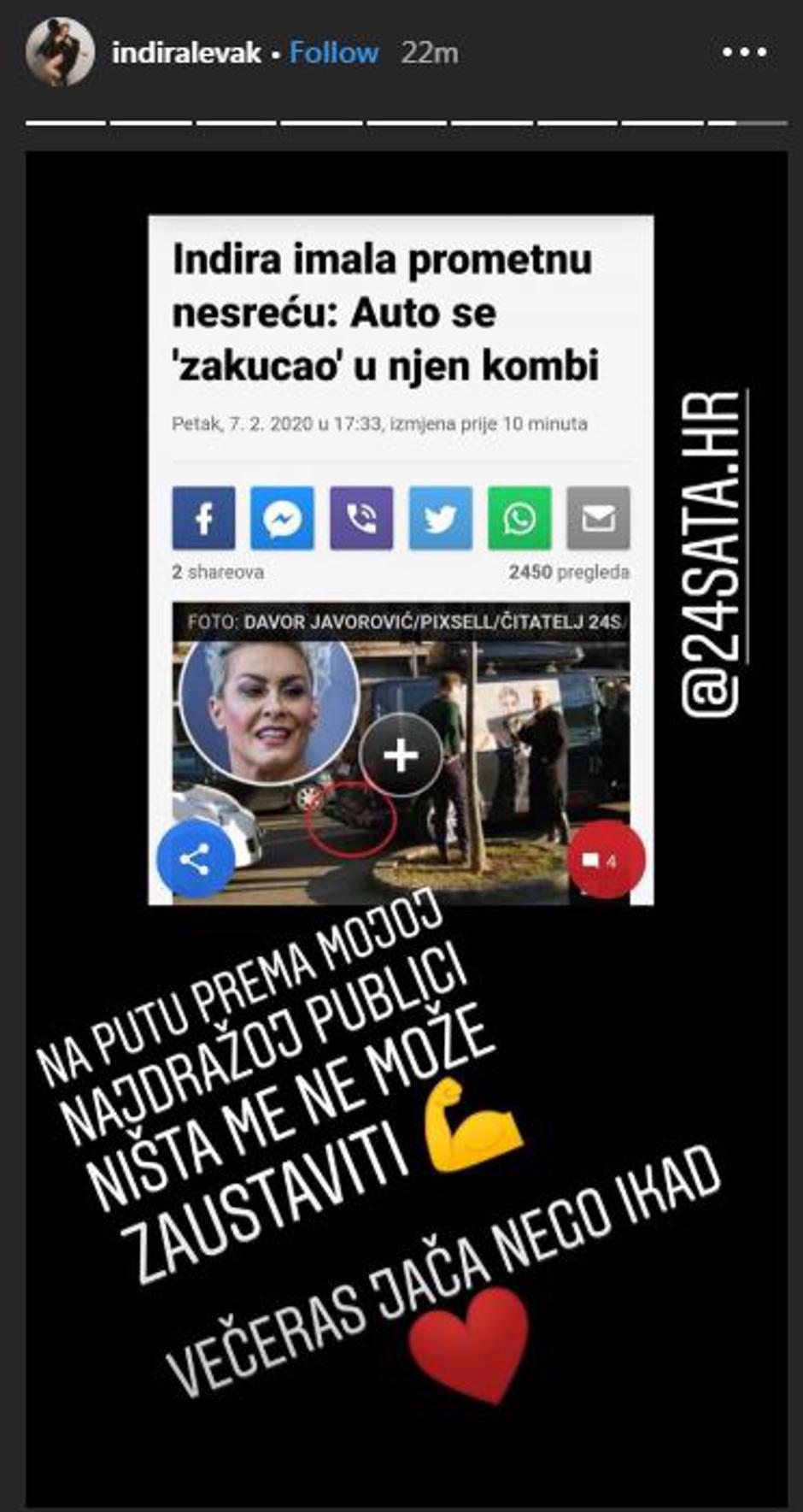 – Glazba ima tu sposobnost okupiti velik broj ljudi i stvoriti pozitivnu atmosferu bilo gdje i bilo kada! Veliko mi je zadovoljstvo bilo biti dio spektakla MAC 2020. u ulozi prezenterice! Želim zahvaliti i svima vama na glasovima za moju pjesmu "Greška u genu", a sada- show time – poručila je na Instagramu Indira.