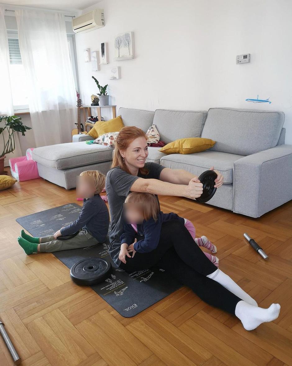 Na fotografiji Nataša sjedi na podu sa svoje dvoje djece, na podlozi za vježbanje, a usput drži uteg.