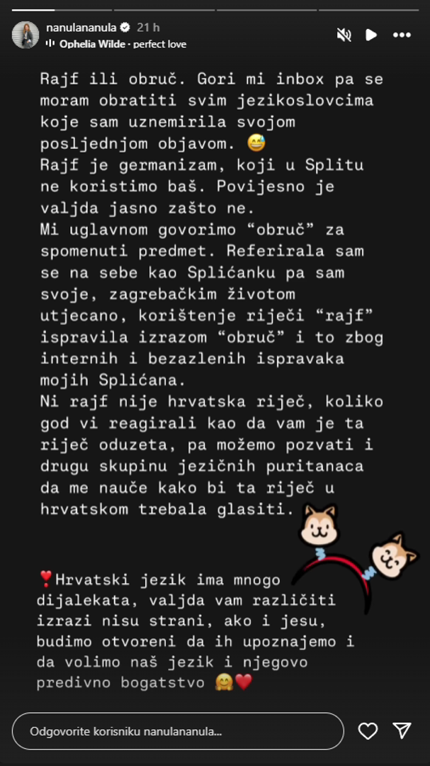 Ni rajf nije hrvatska riječ, koliko god vi reagirali kao da vam je ta riječ oduzeta, pa možemo pozvati i drugu skupinu jezičnih puritanaca da me nauče kako bi ta riječ u hrvatskom trebala glasiti. Hrvatski jezik ima mnogo dijalekata, valjda vam različiti izrazi nisu strani, ako i jesu, budimo otvoreni da ih upoznajemo i da volimo naš jezik i njegovo predivno bogatstvo", poručila je glumica.