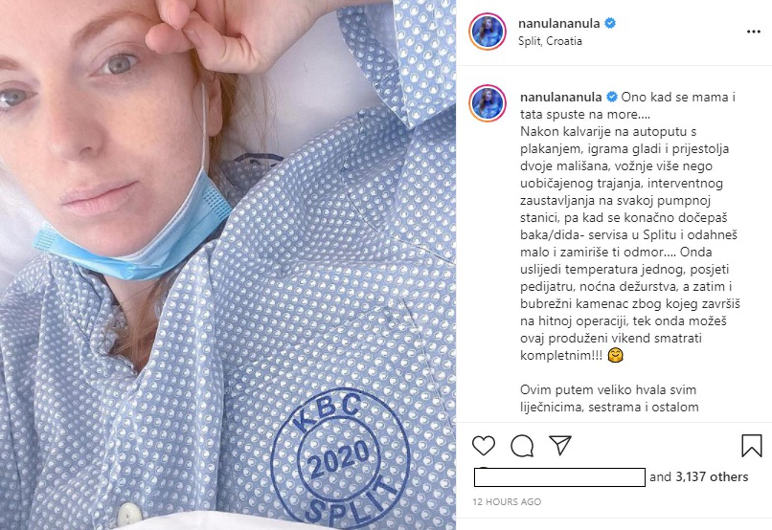 "Ono kad se mama i tata spuste na more… Nakon kalvarije na autoputu s plakanjem, igrama gladi i prijestolja dvoje mališana, vožnje više nego uobičajenog trajanja, interventnog zaustavljanja na svakoj pumpnoj stanici, pa kad se konačno dočepaš baka/dida- servisa u Splitu i odahneš malo i zamiriše ti odmor… Onda uslijedi temperatura jednog, posjeti pedijatru, noćna dežurstva, a zatim i bubrežni kamenac zbog kojeg završiš na hitnoj operaciji, tek onda možeš ovaj produženi vikend smatrati kompletnim!!!" napisala je Nataša i zahvalila osoblju na brizi.