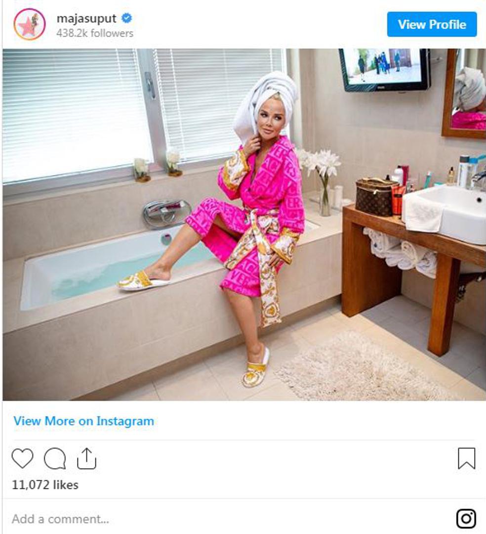 Pjevačica Maja Šuput objavila je novu fotografiju iz svoga doma. na fotografiji je u kupaonici, a na sebi ima raskošan kućni ogrtač brenda Versace, u kojeg su se zaljubili brojni svjetski influenceri, pa i reper Drake. Ogrtač je iz Versaceove kolekcije 'I Love Baroque. U kupaonici se isto tako vidi i televizor koji su mnogi primijetili kada je Maja jednom snimila video kako uređuje supruga Nenada Tatarinova.