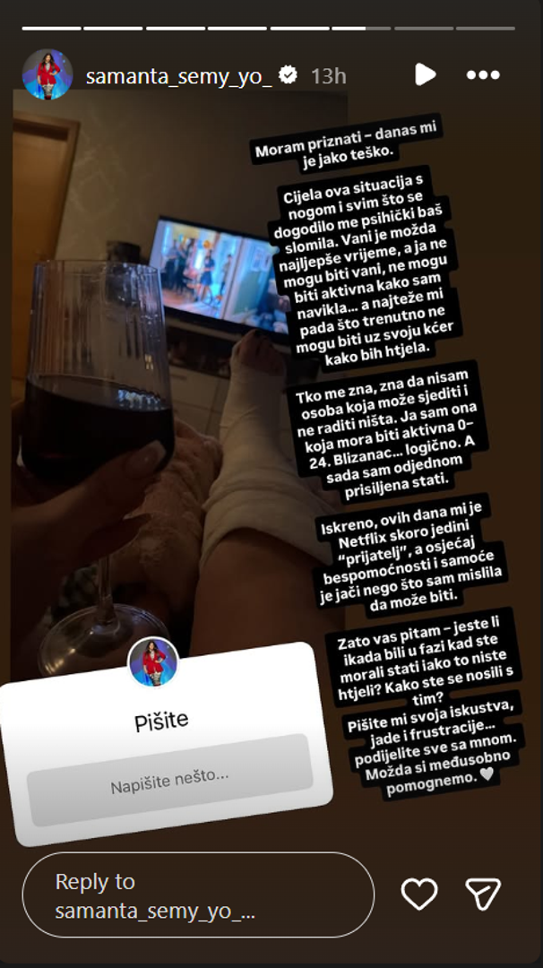 FOTO Prepoznajete li našu bivšu misicu? Ovako je izgledala prije operacije nosa, a njezin izbor za miss obilježio je skandalJučer se tim povodom oglasila i na Instagramu. "Moram priznati - danas mi je jako teško. Cijela ova situacija s nogom i svim što se dogodilo me psihički baš slomila. Vani je možda najljepše vrijeme, a ja ne mogu biti vani, ne mogu biti aktivna kako sam navikla... a najteže mi pada što trenutno ne mogu biti uz svoju kćer kako bih htjela. Tko me zna, zna da nisam osoba koja može sjediti i ne raditi ništa. Ja sam ona koja mora biti aktivna 0-24. Blizanac... logično. A sada sam odjednom prisiljena stati. Iskreno, ovih dana mi je Netflix skoro jedini "prijatelj", a osjećaj bespomoćnosti i samoće je jači nego što sam mislila da može biti. Zato vas pitam - jeste li ikada bili u fazi kad ste morali stati iako to niste htjeli? Kako ste se nosili s tim? Pišite mi svoja iskustva, jade i frustracije... podijelite sve sa mnom. Možda si međusobno pomognemo" napisala je.