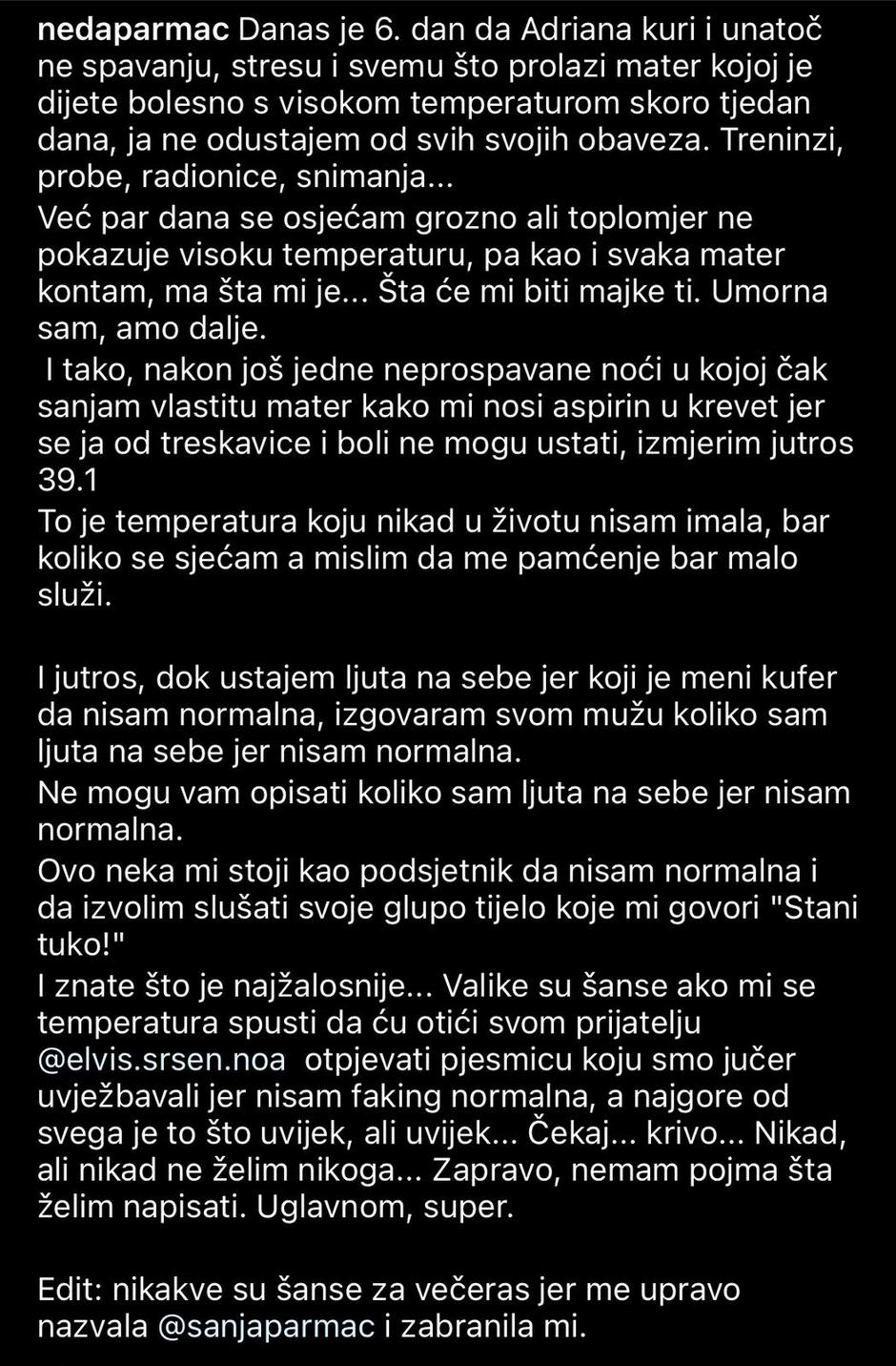 "Danas je šesti dan da Adriana kuri i unatoč nespavanju, stresu i svemu što prolazi mater kojoj je dijete bolesno s visokom temperaturom skoro tjedan dana, ja ne odustajem od svih svojih obaveza. Treninzi, probe, radionice, snimanja... Već nekoliko dana se osjećam grozno, ali toplomjer ne pokazuje visoku temperaturu, pa kao i svaka mater kontam, ma što mi je... Što će mi biti, majke ti. Umorna sam, 'amo dalje. I tako, nakon još jedne neprospavane noći u kojoj čak sanjam vlastitu mater kako mi nosi aspirin u krevet jer se ja od treskavice i boli ne mogu ustati, izmjerim jutros 39.1. To je temperatura koju nikad u životu nisam imala, bar koliko se sjećam, a mislim da me pamćenje bar malo služi. I jutros, dok ustajem ljuta na sebe jer koji je meni kufer da nisam normalna, izgovaram svom mužu koliko sam ljuta na sebe jer nisam normalna. Ne mogu vam opisati koliko sam ljuta na sebe jer nisam normalna. Ovo neka mi stoji kao podsjetnik da nisam normalna i da izvolim slušati svoje glupo tijelo koje mi govori 'Stani, tuko!' I znate što je najžalosnije... Velike su šanse ako mi se temperatura spusti, da ću otići svom prijatelju Elvisu Sršenu Noi otpjevati pjesmicu koju smo jučer uvježbavali jer nisam normalna, a najgore je to što uvijek, ali uvijek... Čekaj... Krivo... Nikad, ali nikad ne želim nikoga... Zapravo, nemam pojma što želim napisati. Uglavnom, super", napisala je.