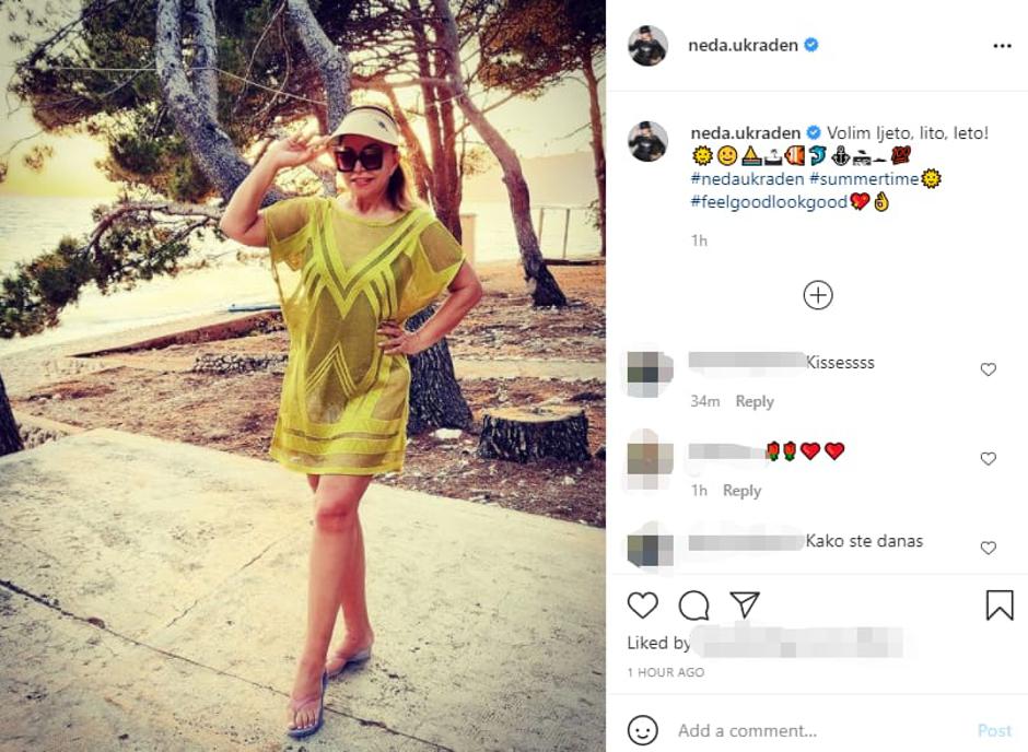 Pjevačica Neda Ukraden (70) na svojem je Instagram profilu objavila fotografiju na kojoj je pozirala na plaži u kratkoj haljini, ispod koje je nosila crni badić. "Volim ljeto, lito, leto", napisala je pjevačica u opisu, a istaknula je hešteg kojim poručuje da se osjeća lijepo i izgleda lijepo.