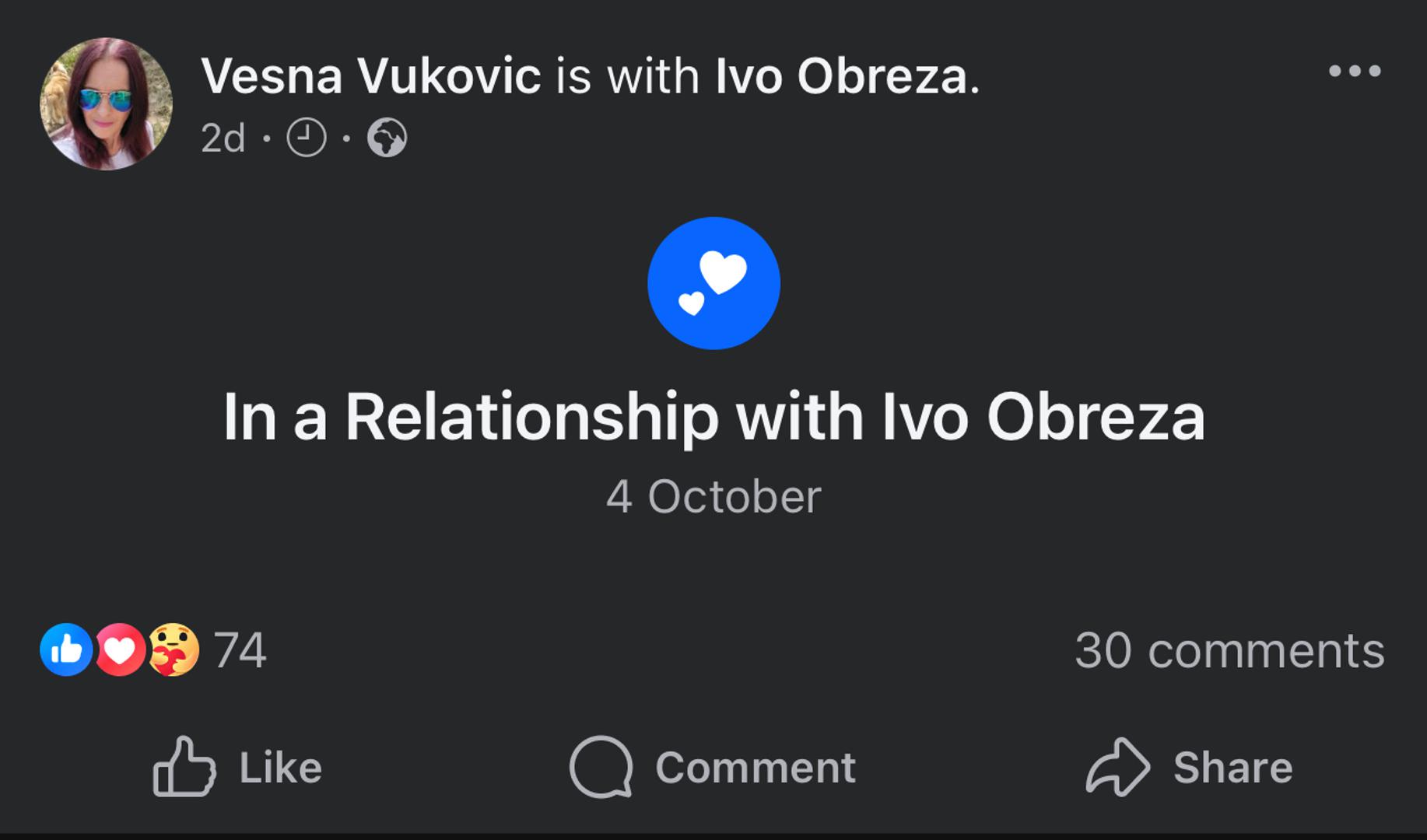 FOTO Evo kako se Tina Katanić mijenjala kroz godine: Nekadašnja loto djevojka povukla se iz javnostiDo pomirenja je došlo na iznimno značajan datum, Vesnin rođendan, što je ovom paru pružilo dodatan povod za proslavu. Konkretno, Vesna je na svom Facebook profilu ažurirala status veze iz ‘slobodna’ u ‘u vezi s Ivom Obrezom’. Njezina prijateljica je to prokomentirala s: ‘opet’, na što je Vuković uzvratila: "Ni prvi ni zadnji što su si dali novu priliku". Sve ranije statuse je obrisala.