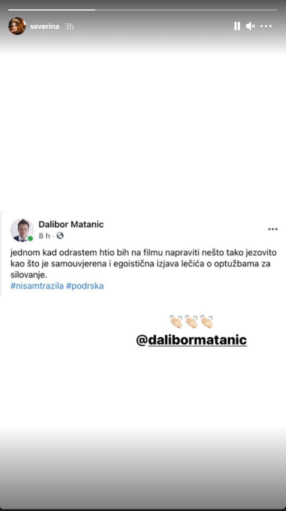 Među glumcima koji su jasno stali uz Danijelu su Goran Bogdan (40) i Tihana Lazović (30), a pridružili su im se i redatelj Dalibor Matanić (46) kojeg je Severina (48) citirala u svojoj Instagram priči te se pridružila krugu podrške.