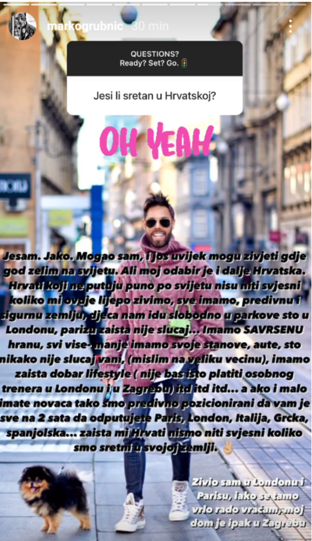 "Mogao sam i još uvijek mogu živjeti gdje god želim na svijetu, ali moj odabir je i dalje Hrvatska. Hrvati koji ne putuju puno po svijetu nisu niti svjesni koliko mi ovdje lijepo živimo, sve imamo, predivnu i sigurnu zemlju, djeca nam idu slobodno u parkove što u Londonu, Parizu zaista nije slučaj... Imamo savršenu hranu, svi više-manje imamo svoje stanove, aute što nikako nije slučaj vani (mislim na veliku većinu), imamo zaista dobar lifestyle (nije baš isto platiti osobnog trenera u Londonu i Zagrebu)", istaknuo je Marko.