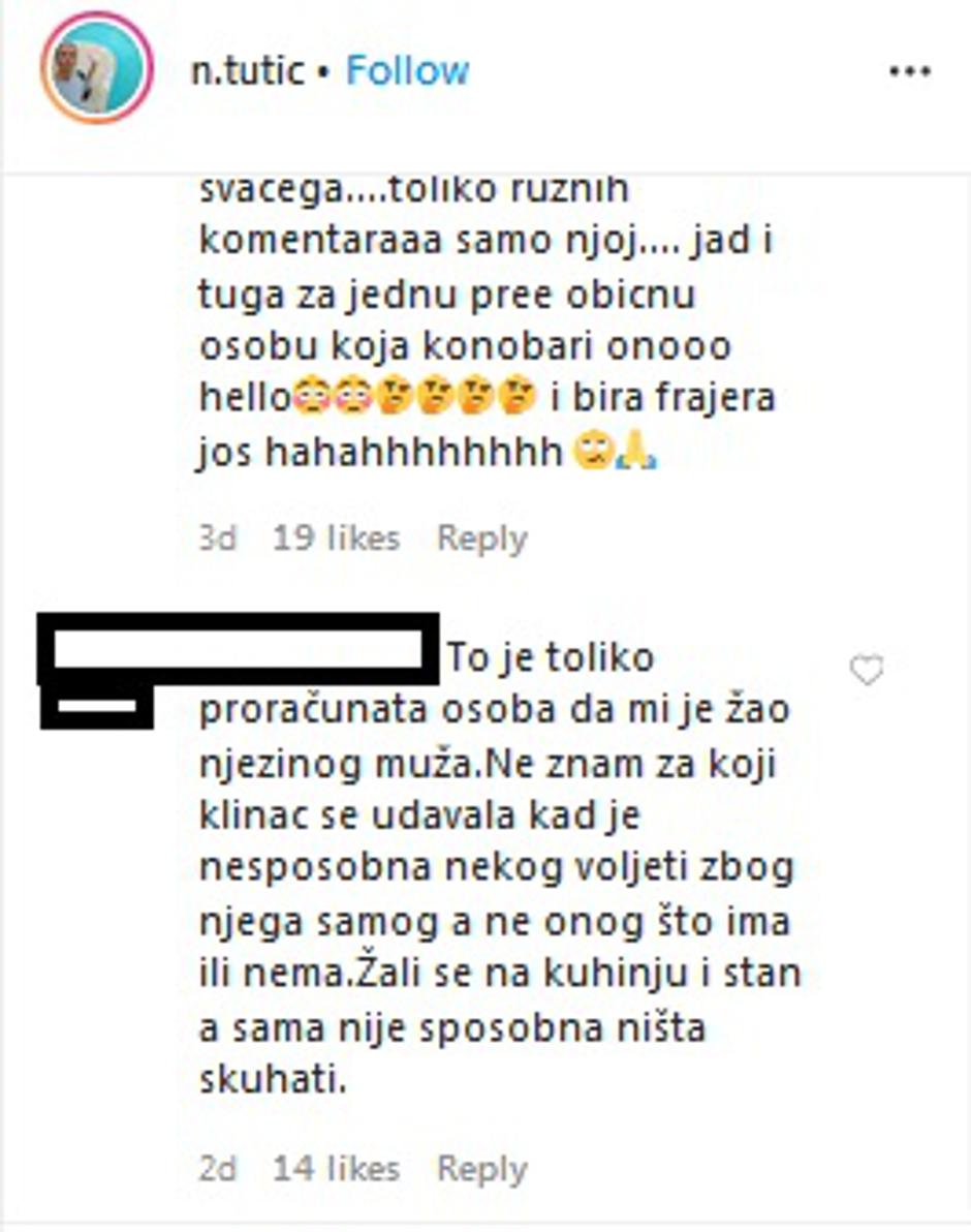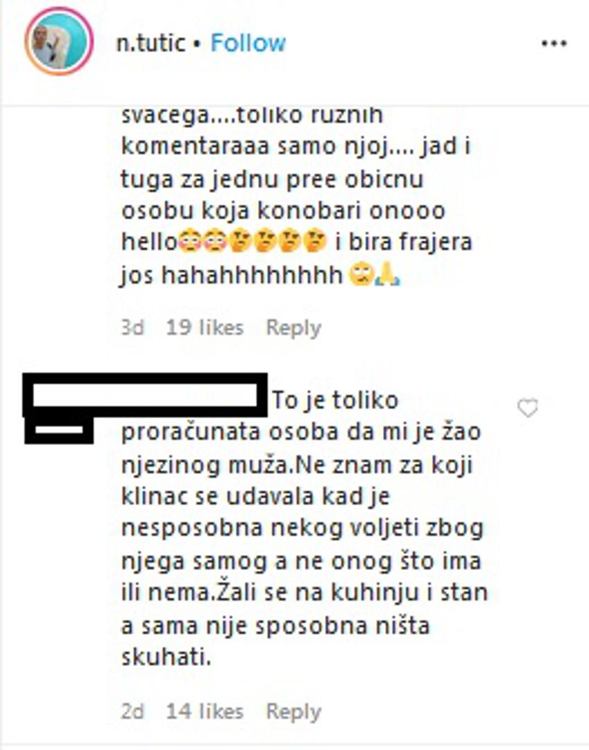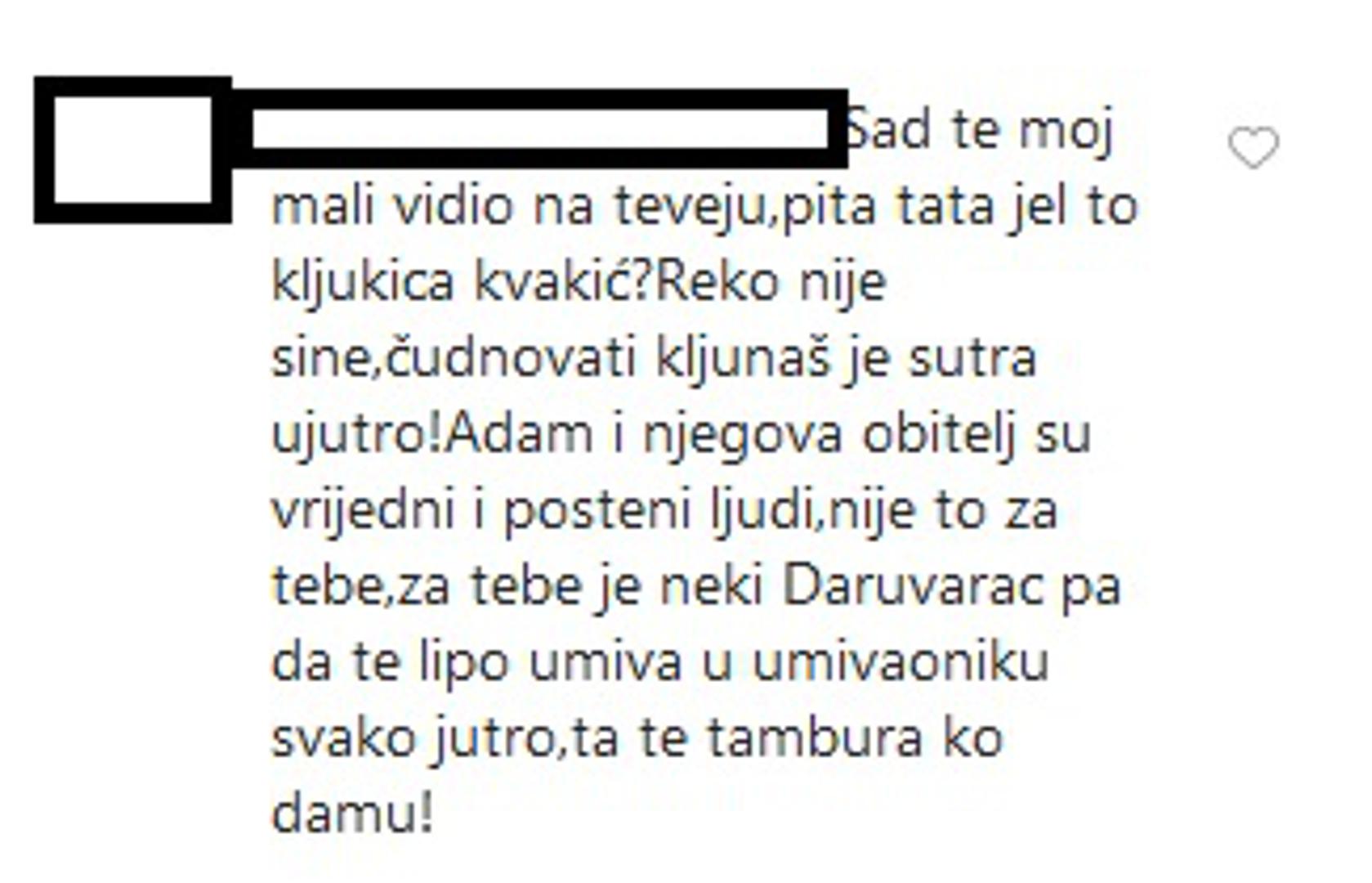 Neki su čak otišli toliko daleko da su komentirali kako bi trebala dobiti batine. "Sad te moj mali vidio na TV-u, pita tata jel to kljukica kvakić? Rekô nije sine,čudnovati kljunaš je sutra ujutro! Adam i njegova obitelj su vrijedni i pošteni ljudi, nije to za tebe, za tebe je neki Daruvarac pa da te lipo umiva u umivaoniku svako jutro, da te tambura ko damu!" glasi jedan od komentara. Nikolini je nakon svega prekipjelo pa se i sama odlučila obračunati s dežurnim dušobrižnicima.