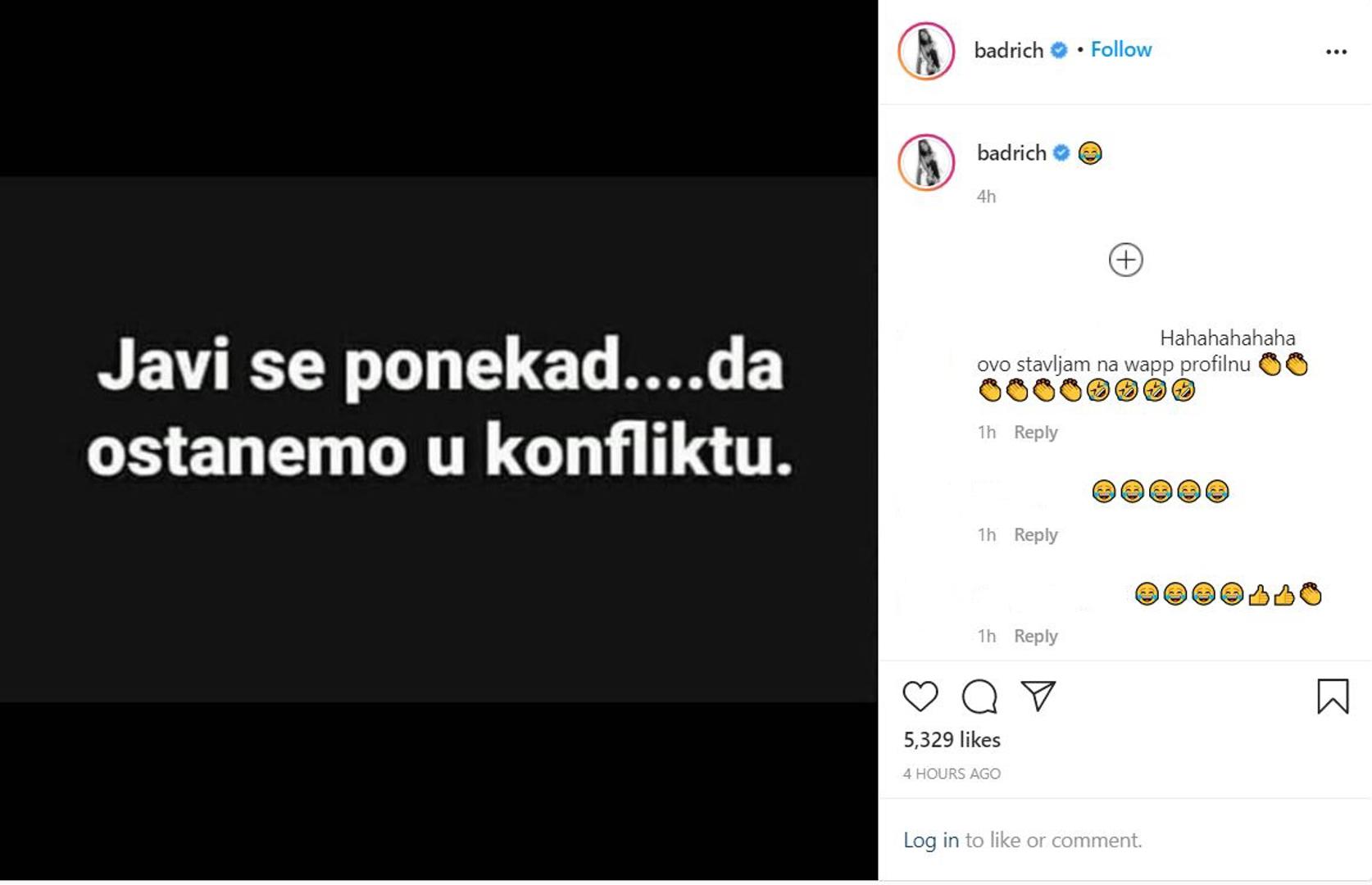 Podijelila je meme s tekstom 'Javi se ponekad...da ostanemu u konfliktu'. Njezini pratitelji pohrlili su joj podijeliti lajkove, te u komentarima pisali koliko ih je nasmijala.