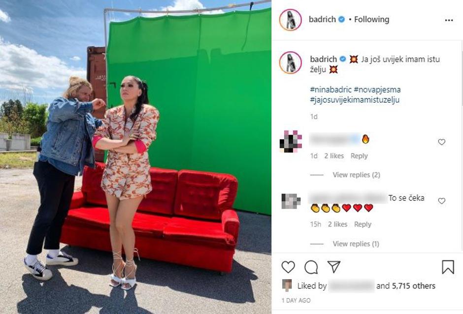 Nina Badrić uskoro će predstaviti novu pjesmu "Ja još uvijek imam istu želju", a za nju je jučer snimala video spot. Na Instagramu je objavila fotografiju sa snimanja na kojoj pozira ispred crvenog kauča, odjevena samo u sako, a na nogama ima bijele sandale na petu.