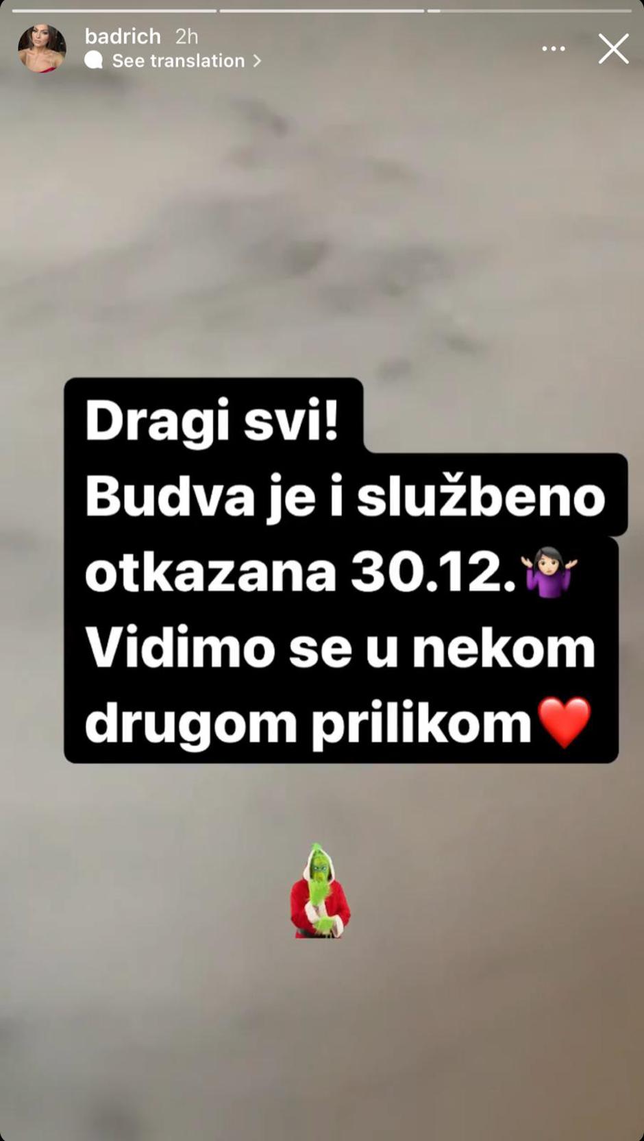 -Dragi svi, Budva je i službeno otkazana 30.12. Vidimo se nekom drugom prilikom- napisala je Nina na svoje Instagram storyju i zasigurno rastužila brojne obožavatelje koji su još kada je najavila nastup bili oduševljeni, a mnogi su komentirali i kako napokon znaju gdje će proslaviti Novu godinu.