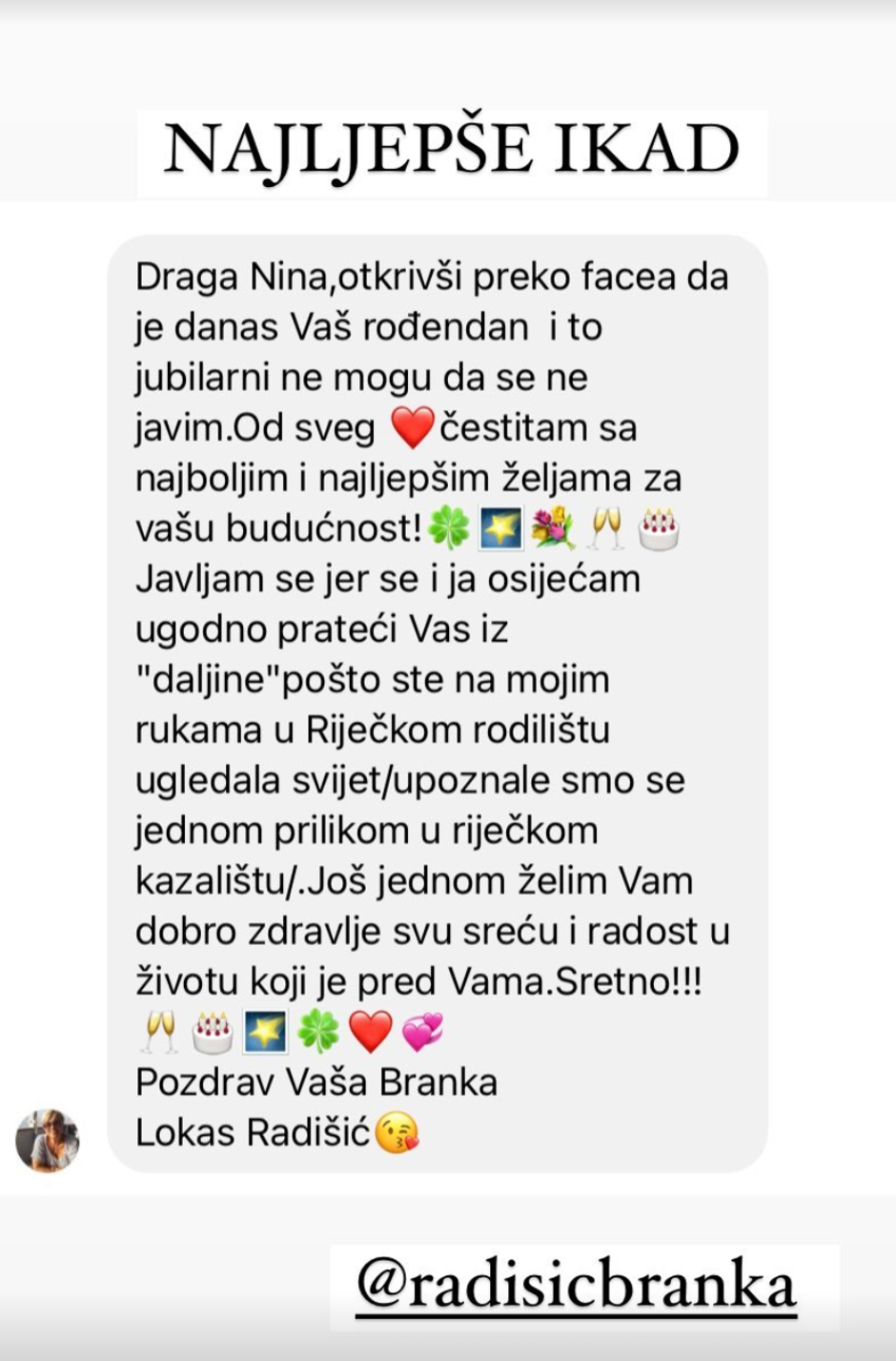 „Draga Nina, otkrivši preko Facebooka da je danas vaš rođendan i to jubilarni ne mogu da se ne javim. Od sveg srca čestitam s najboljim i najljepšim željama za vašu budućnost! Javljam se jer se i ja osjećam ugodno prateći vas 'iz daljine' budući ste na mojim rukama u riječkom rodilištu ugledala svijet / upoznale smo se jednom prilikom u riječkom kazalištu“, poručila joj je Branka Radišić. "Najljepše ikad", poručila je tek kratko oduševljena Nina.
