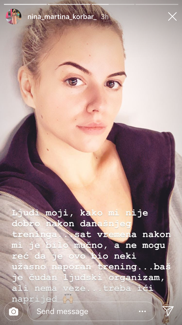 "Ljudi moji, kako mi nije dobro nakon današnjeg treninga... Sat vremena nakon mi je bilo mučno, a ne mogu reći da je ovo bio neki užasno naporan trening. Baš je čudan ljudski organizam, ali nema veze... Treba ići naprijed", napisala je lijepa Nina uz fotku.