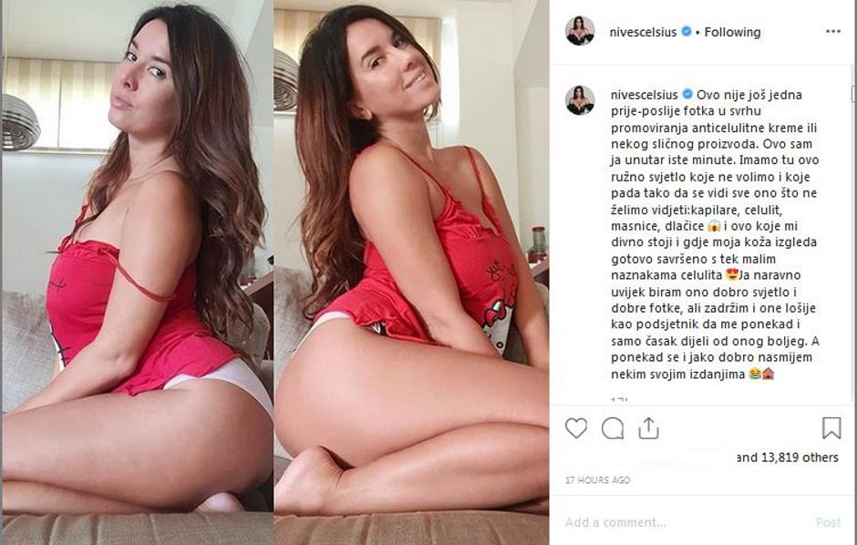 "Ovo nije još jedna prije – poslije fotka u svrhu promoviranja anticelulitne kreme ili nekog sličnog proizvoda. Ovo sam ja unutar iste minute. Imamo tu ovo ružno svjetlo koje ne volimo i koje pada tako da se vidi sve ono što ne želimo vidjeti: kapilare, celulit, masnice, dlačice. I ovo koje mi divno stoji i gdje moja koža izgleda gotovo savršeno s tek malim naznakama celulita. Ja, naravno, uvijek biram ono dobro svjetlo i dobre fotke, ali zadržim i one lošije kao podsjetnik na to da me ponekad i samo časak dijeli od onog boljeg. A ponekad se i jako dobro nasmijem nekim svojim izdanjima", napisala je Nives.