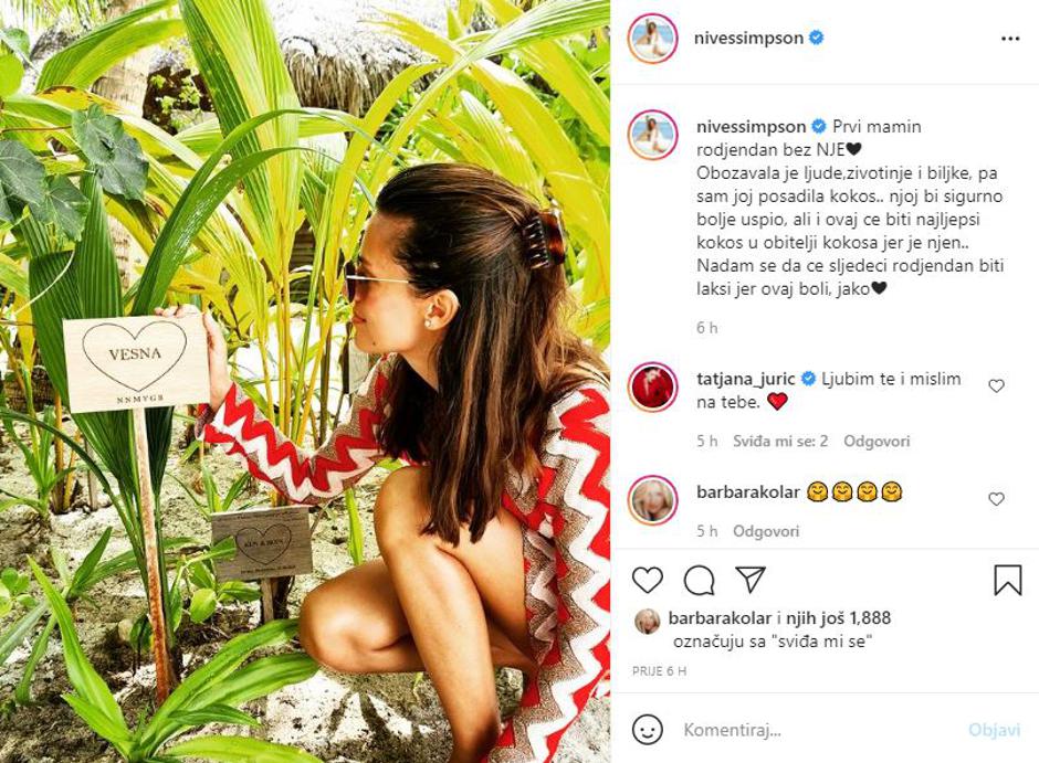 "Prvi mamin rođendan bez nje. Obožavala je ljude, životinje i biljke pa sam joj posadila kokos. Njoj bi sigurno bolje uspio, ali i ovaj će biti najljepši kokos u obitelji kokosa jer je njen... Nadam se da će sljedeći rođendan biti lakši jer ovaj boli, jako", napisala je Nives ispod fotografije na kojoj pozira pored posađenog kokosa i drvene ploče na kojoj je ime njene majke.