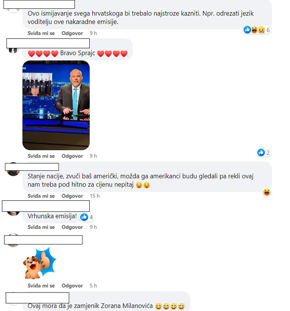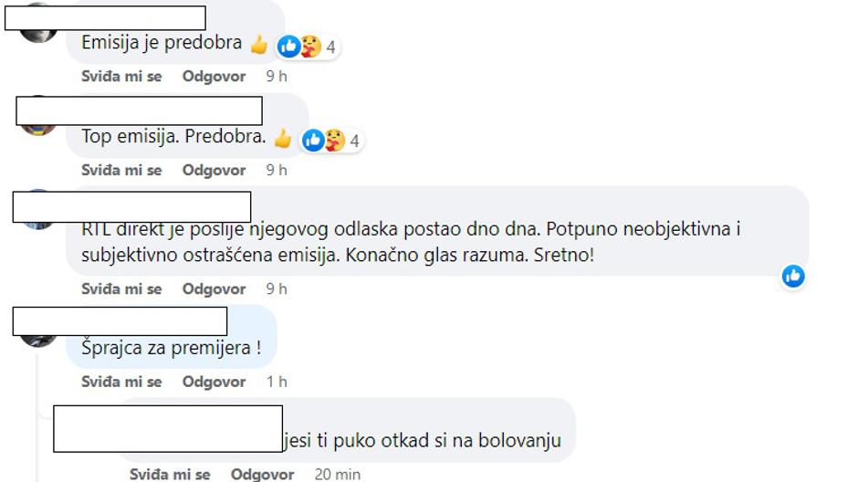 "Emisija je predobra", "Top emisija", "Vrhunska emisija", "Šprajca za premijera", nizali su se komentari oduševljenih gledatelja.