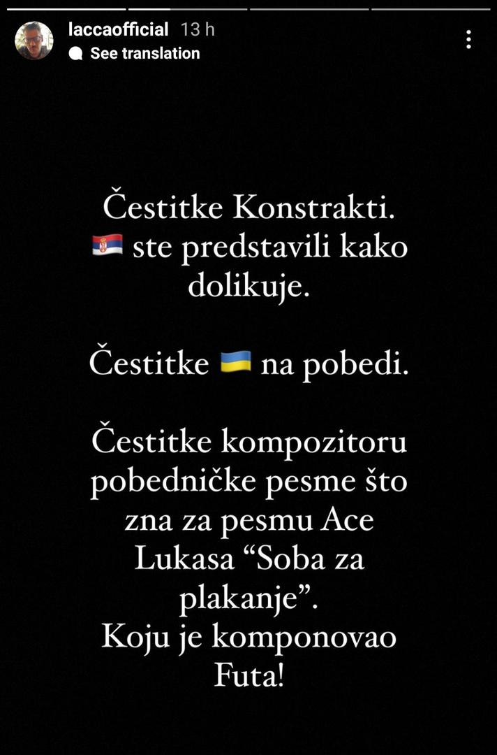 - Čestitke Konstrakti. Srbiju ste predstavili kako dolikuje. Čestitke Ukrajini na pobjedi. Čestitke kompozitoru pobjedničke pjesme što zna za pjesmu Ace Lukasa ‘Soba za plakanje’, koju je ukomponirao Futa - napisao je Laća.