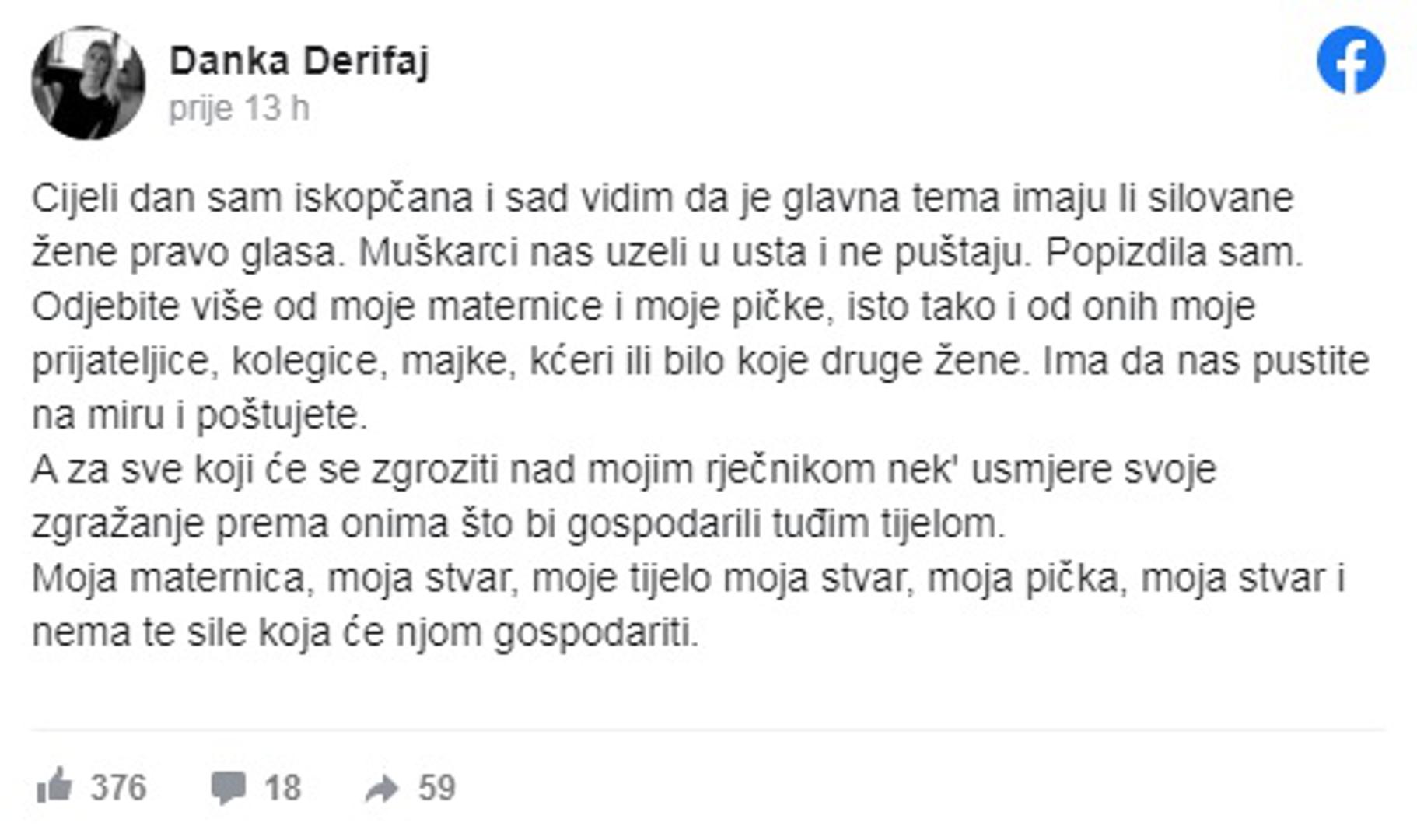 Moja maternica, moja stvar, moje tijelo moja stvar, moja p***a, moja stvar i nema te sile koja će njom gospodariti - napisala je Danka Derifaj na Facebooku i dobila brojne poruke podrške i više od 500 lajkova.