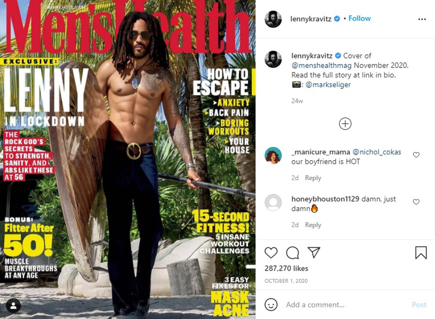 Rocker Lenny Kravitz (57) oduševio je pratitelje na Instagramu fotografijom na kojoj pozira bez majice. Fotografija glazbenikovog isklesanog tijela dobila je gotovo 500 tisuća lajkova, ali i brojne komentare pratitelja, među kojima je bilo i puno poznatih osoba.