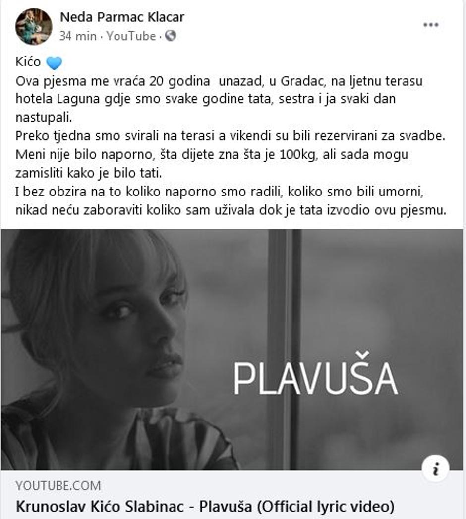 Ista pjesma posebno je emotivna i za pjevačicu Nedu Parmać Klačar. "Ova pjesma me vraća 20 godina unazad, u Gradac, na ljetnu terasu hotela Laguna, gdje smo svake godine tata, sestra i ja svaki dan nastupali. Preko tjedna smo svirali na terasi, a vikendi su bili rezervirani za svadbe. Meni nije bilo naporno, što dijete zna što je 100 kg, ali sada mogu zamisliti kako je bilo tati. I bez obzira na to koliko naporno smo radili, koliko smo bili umorni, nikad neću zaboraviti koliko sam uživala dok je tata izvodio ovu pjesmu", poručila je Neda.