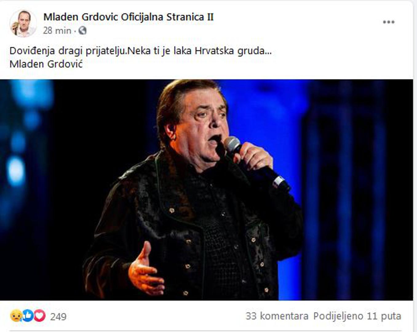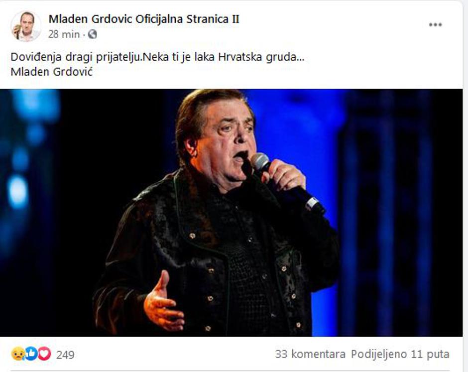 Posljednji pozdrav Kići uputio je i Mladen Grdović. "Doviđenja, dragi prijatelju. Neka ti je laka hrvatska gruda", napisao je Grdović na svojoj službenoj Facebook stranici.