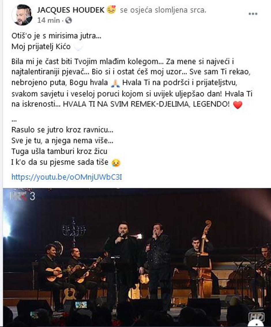 "Otiš’o je s mirisima jutra...Moj prijatelj Kićo. Bila mi je čast biti Tvojim mlađim kolegom... Za mene si najveći i najtalentiraniji pjevač... Bio si i ostat ćeš moj uzor... Sve sam Ti rekao, nebrojeno puta, Bogu hvala. Hvala Ti na podršci i prijateljstvu, svakom savjetu i veseloj poruci kojom si uvijek uljepšao dan! Hvala Ti na iskrenosti... HVALA TI NA SVIM REMEK-DJELIMA, LEGENDO!" napisao je Jacques.
