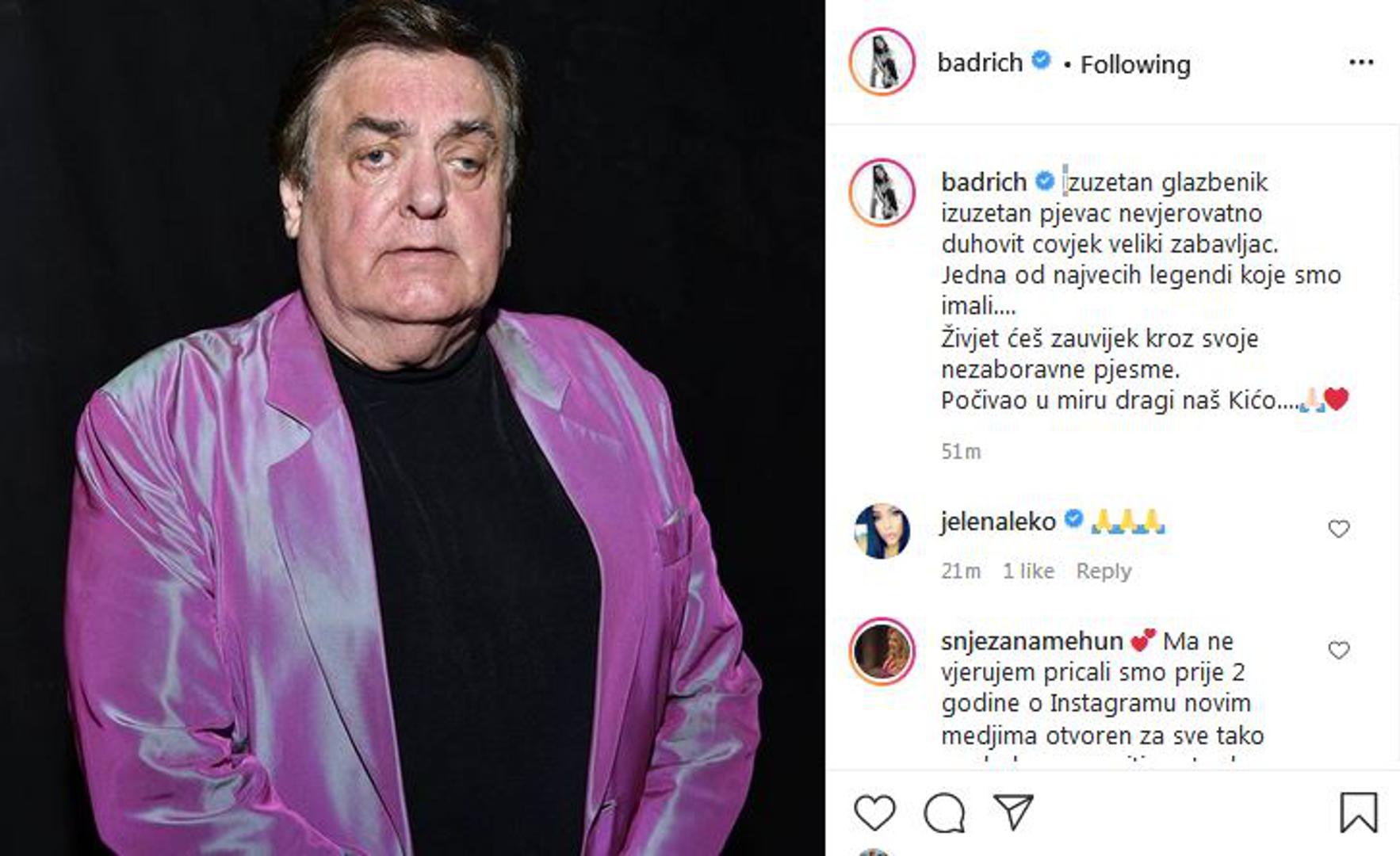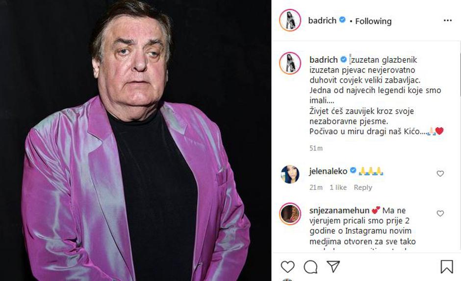 Shrvana je bila i Nina Badrić. "Izuzetan glazbenik, izuzetan pjevač, nevjerojatno duhovit čovjek, veliki zabavljač. Jedna od najvećih legendi koje smo imali....Živjet ćeš zauvijek kroz svoje nezaboravne pjesme. Počivao u miru. dragi naš Kićo", poručila je Nina.