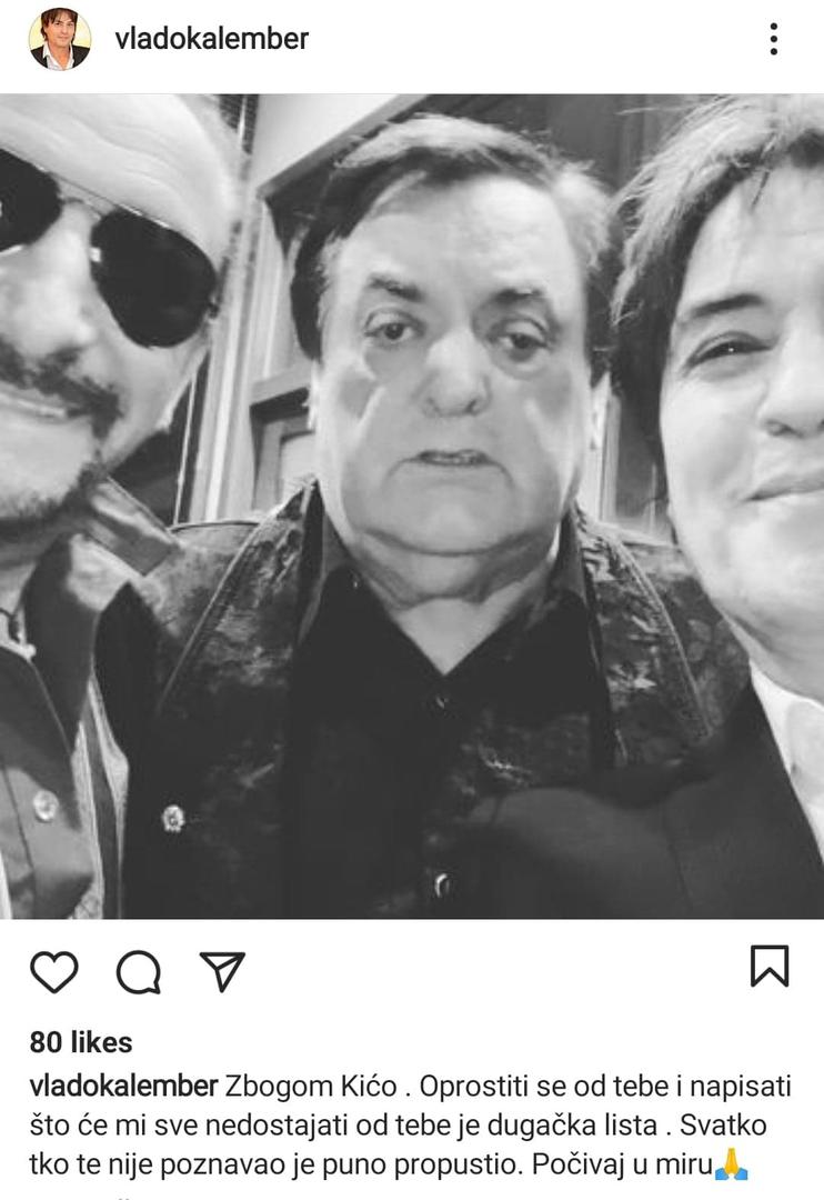"Zbogom Kićo. Oprostiti se od tebe i napisati što će mi sve nedostajati od tebe je dugačka lista. Svatko tko te nije poznavao je puno propustio. Počivaj u mir", napisao je Kalember i objavio zajedničku sliku također i s glazbenikom Željkom Bebekom.