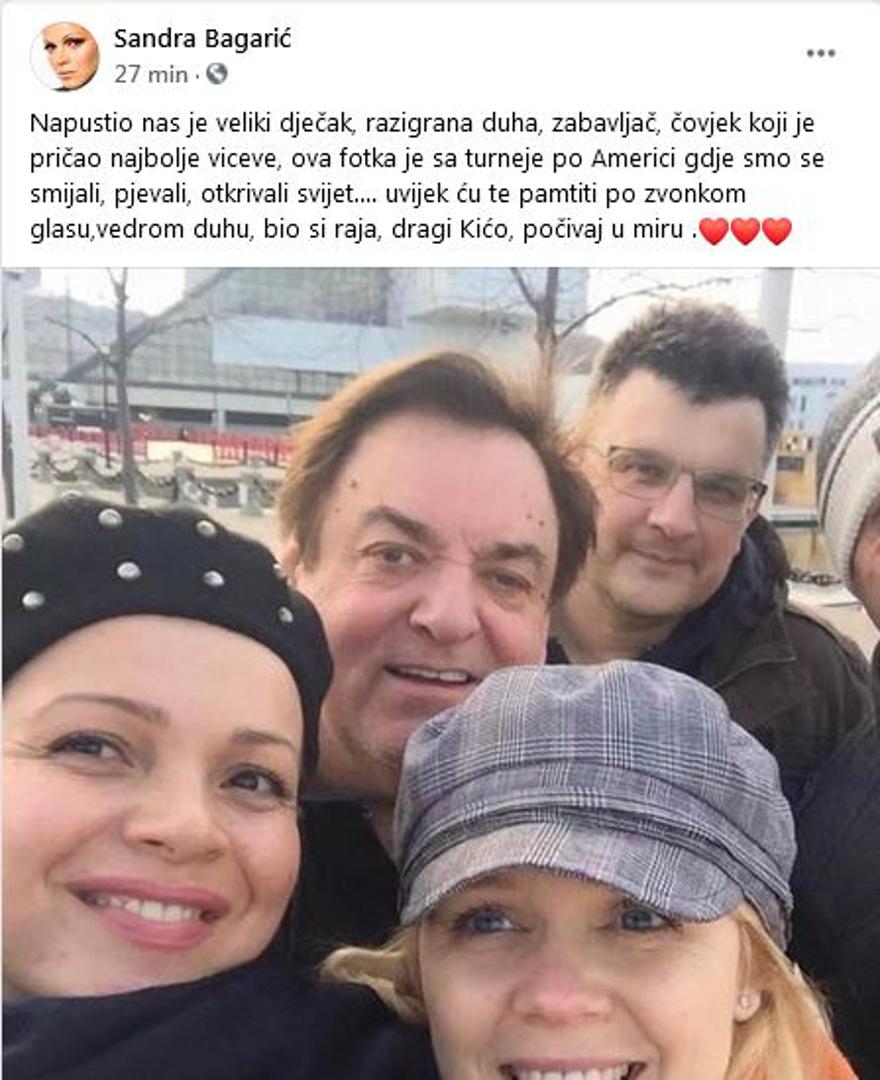 "Napustio nas je veliki dječak, razigrana duha, zabavljač, čovjek koji je pričao najbolje viceve. Ova fotka je s turneje po Americi gdje smo se smijali, pjevali, otkrivali svijet.... uvijek ću te pamtiti po zvonkom glasu, vedrom duhu, bio si raja, dragi Kićo, počivaj u miru", napisala je Sandra.