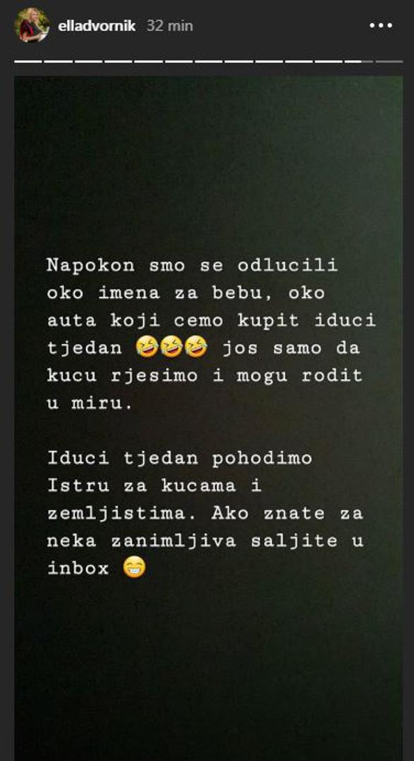 - Konačno smo se odlučili oko imena za bebu, oko auta koji ćemo kupiti idući tjedan, još samo da kuću riješimo i u miru mogu roditi - napisala je Ella, a zatim obavijestila pratitelje da su u potrazi za kućom u Istri.