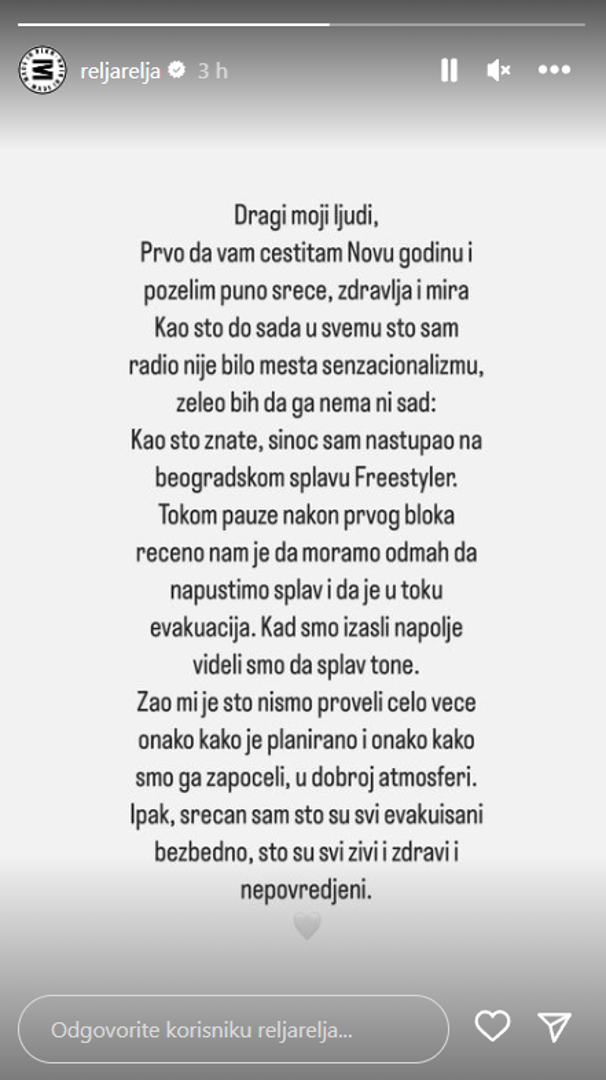 Nakon potonuća splavi "Freestyler" u Beogradu na društvenim mrežama oglasio se i pjevač Relja Popović, koji je tamo nastupao sinoć na novogodišnjem dočeku.