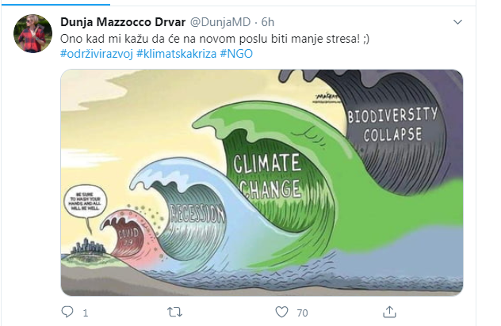 - Ono kad mi kažu da će na novom poslu biti manje stresa - napisala je u objavi te za Story obznanila kako će se pridružiti Društvu za oblikovanje održivog razvoja, udruge stručnjaka koja se bavi promicanjem održivog razvoja na području energetike.