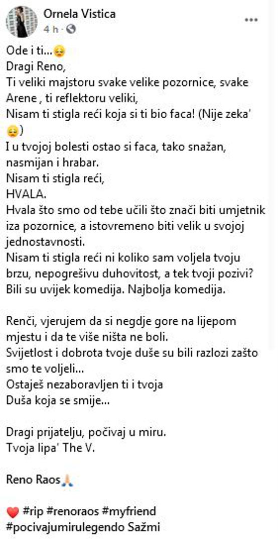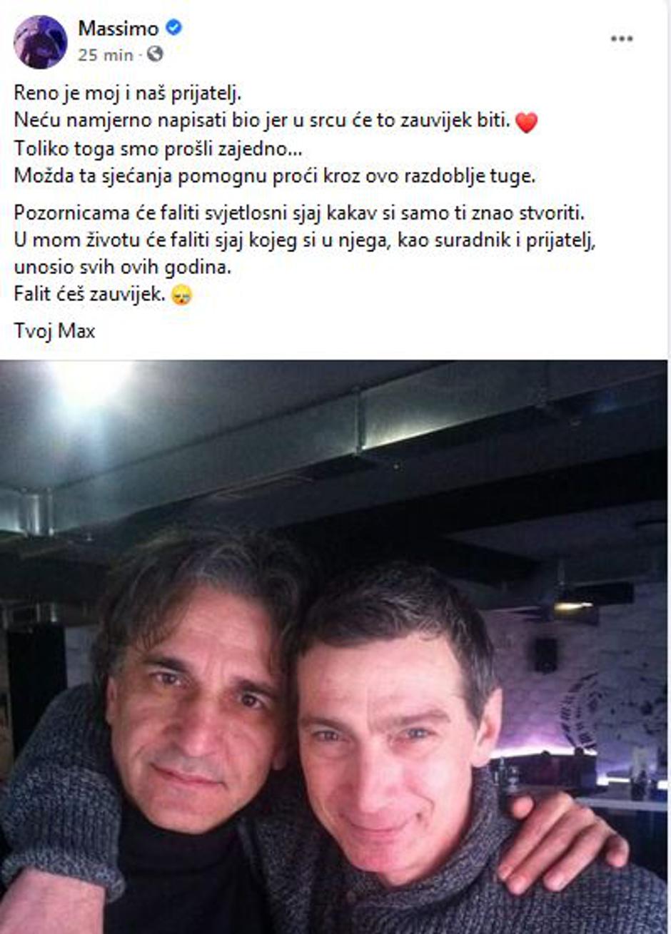 Podsjetimo, od Raosa se u nedjelju oprostila i Severina, a jučer je to prvi učinio Massimo. - Reno je moj i naš prijatelj. Neću namjerno napisati bio jer u srcu će to zauvijek biti. Toliko toga smo prošli zajedno... Možda ta sjećanja pomognu proći kroz ovo razdoblje tuge. Pozornicama će faliti svjetlosni sjaj kakav si samo ti znao stvoriti. U mom životu će faliti sjaj kojeg si u njega, kao suradnik i prijatelj, unosio svih ovih godina. Falit ćeš zauvijek - stoji u objavi koju je potpisao s 'Tvoj Max'.