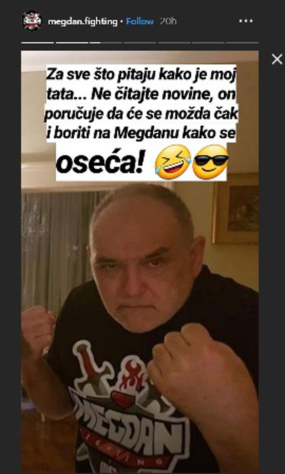 "Za sve što pitaju kako je moj tata... Ne čitajte novine, on poručuje da će se možda čak i boriti na Megdanu kako se osjeća!", napisao je Aleksa.