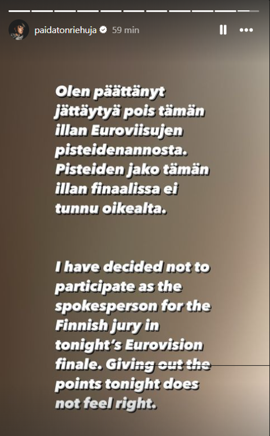 Premda je bilo objavljeno kako će glasove finskog žirija čitati Käärijä, koji je prošle godine u Liverpoolu osvojio drugo mjesto, on je večeras objavio da odustaje od tog zadataka.