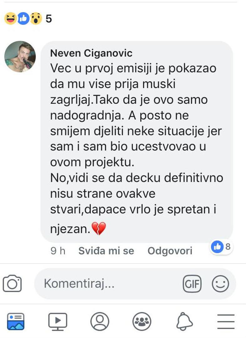 - Već u prvoj emisiji je pokazao da mu više prija muški zagrljaj. Tako da je ovo samo nadogradnja. A pošto ne smijem dijeliti neke situacije jer sam i sam sudjelovao u ovom projektu. No, vidi se da dečku definitivno nisu strane ovakve stvari, dapače vrlo je spretan i nježan - komentirao je Ciganović i uz poruku ostavio znak srca.