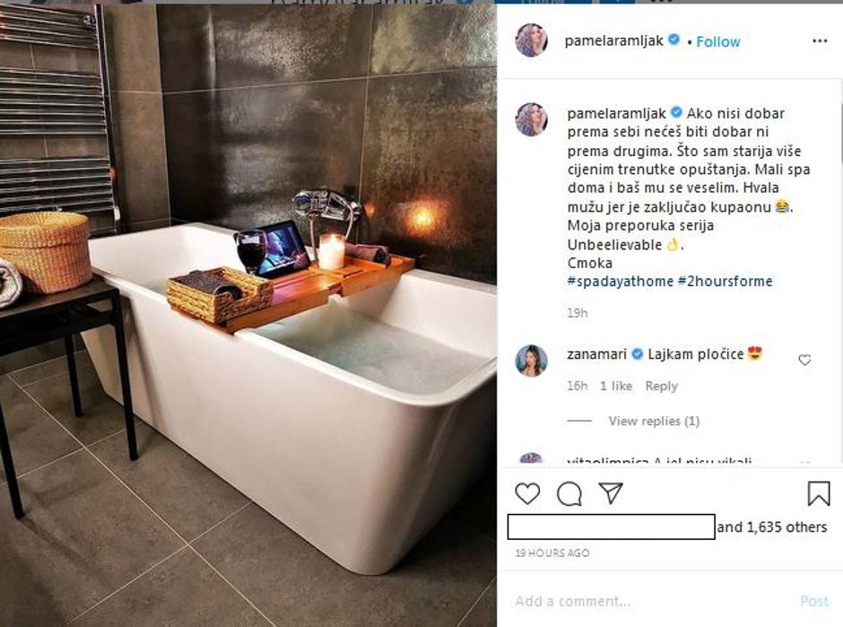 "Ako nisi dobar prema sebi, nećeš biti dobar ni prema drugima. Što sam starija, više cijenim trenutke opuštanja. Mali spa doma i baš mu se veselim. Hvala mužu jer je zaključao kupaonu", napisala je Pamela u opisu fotografije i otkrila kako vrijeme u kadi najradije provodi gledajući seriju Unbelievable koju je preporučila pratiteljima.