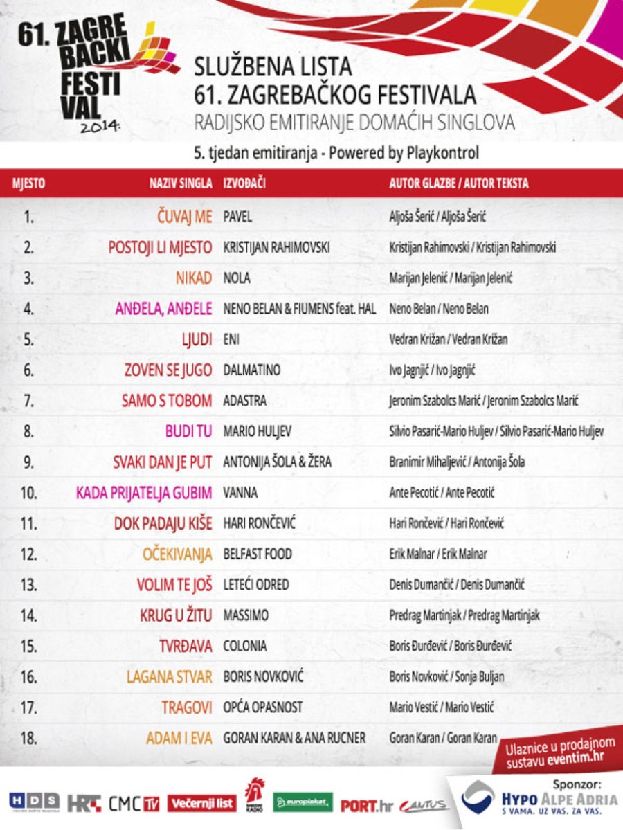 Novi tjedan i nova promjena na vrhu top liste emitiranja pjesama 61. Zagrebačkog festivala! Pavel i njihova retro pjesma Čuvaj me najemitiraniji je singl u 5. tjednu emitiranja, slijede Kristijan Rahimovski s prošlotjednim brojem jedan Postoji li mjesto, zatim Nola i Nikad na trećem, a za njima Neno Belan, ENI, Dalmatino…
