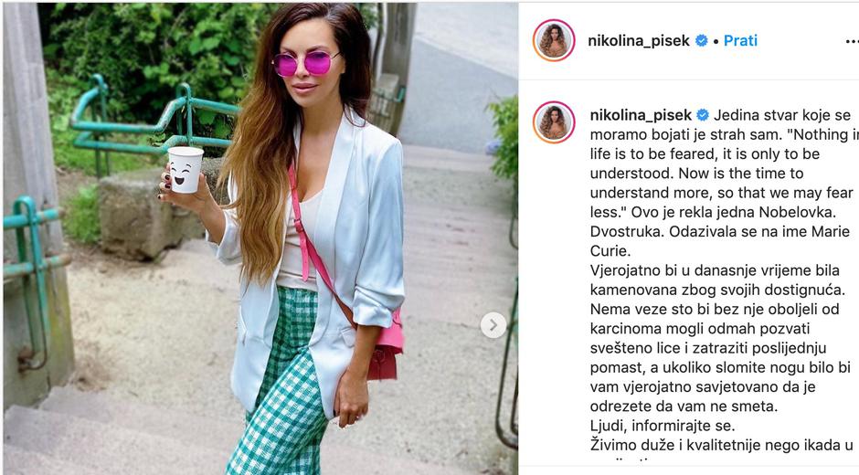 - Jedina stvar koje se moramo bojati je strah sam. "Nothing in life is to be feared, it is only to be understood. Now is the time to understand more, so that we may fear less." Ovo je rekla jedna Nobelovka. Dvostruka. Odazivala se na ime Marie Curie. Vjerojatno bi u današnje vrijeme bila kamenovana zbog svojih dostignuća. Nema veze što bi bez nje oboljeli od karcinoma mogli odmah zatražiti posljednju pomast, a ako slomite nogu bilo bi vam vjerojatno savjetovano da je odrežete da vam ne smeta. Ljudi, informirajte se. Živimo duže i kvalitetnije nego ikada u povijesti. A to nije zasluga molitve kao takve. Ili barem ne samo nje... – poručila je Pišek i dodala hashtag #antivaccersgettothebackoftheline.