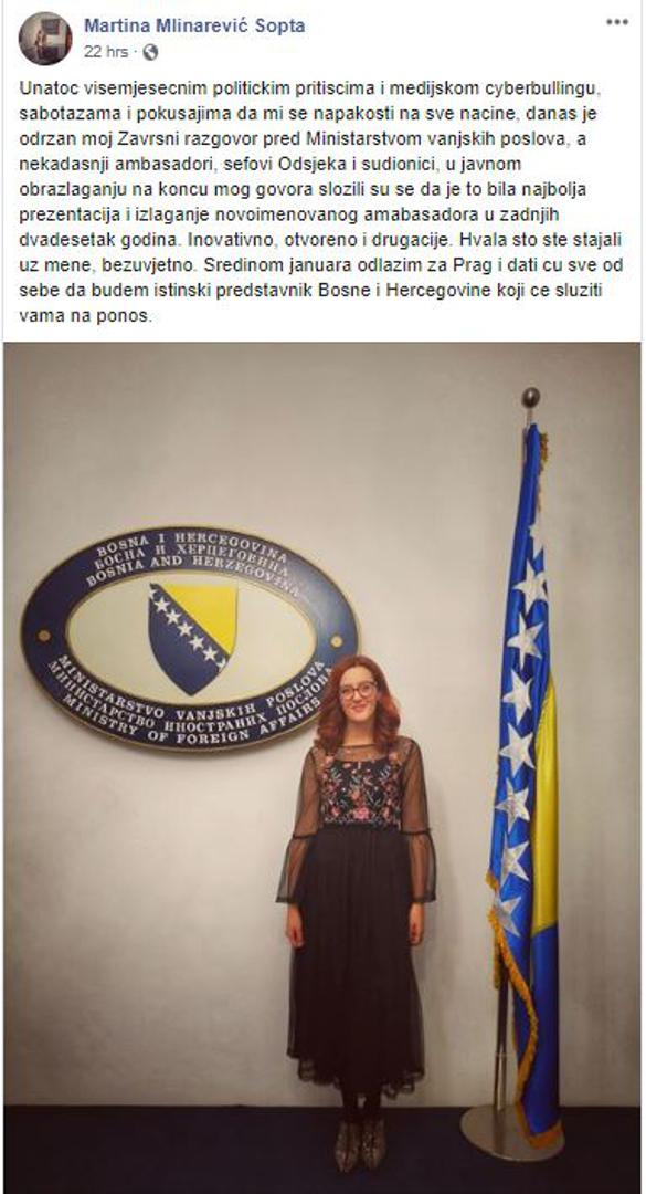"Unatoč višemjesečnim političkim pritiscima i medijskom cyberbullyingu, sabotažama i pokušajima da mi se napakosti na sve načine, danas je održan moj završni razgovor pred Ministarstvom vanjskih poslova, a nekadašnji ambasadori, šefovi Odsjeka i sudionici, u javnom obrazlaganju na koncu mog govora složili su se da je to bila najbolja prezentacija i izlaganje novoimenovanog ambasadora u zadnjih dvadesetak godina. Inovativno, otvoreno i drugačije. Hvala što ste stajali uz mene, bezuvjetno. Sredinom siječnja odlazim za Prag i dat ću sve od sebe da budem istinski predstavnik Bosne i Hercegovine koji će služiti vama na ponos."